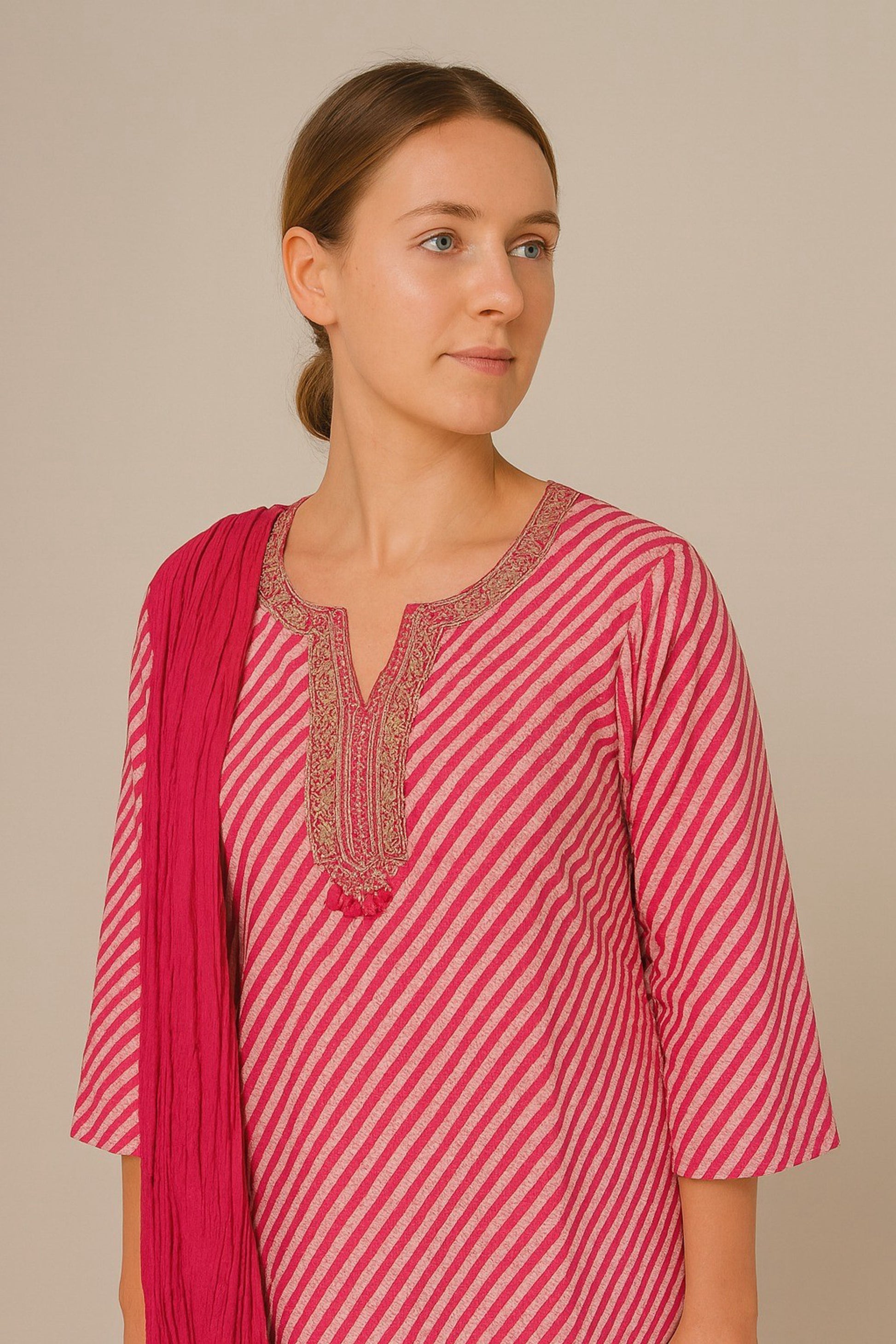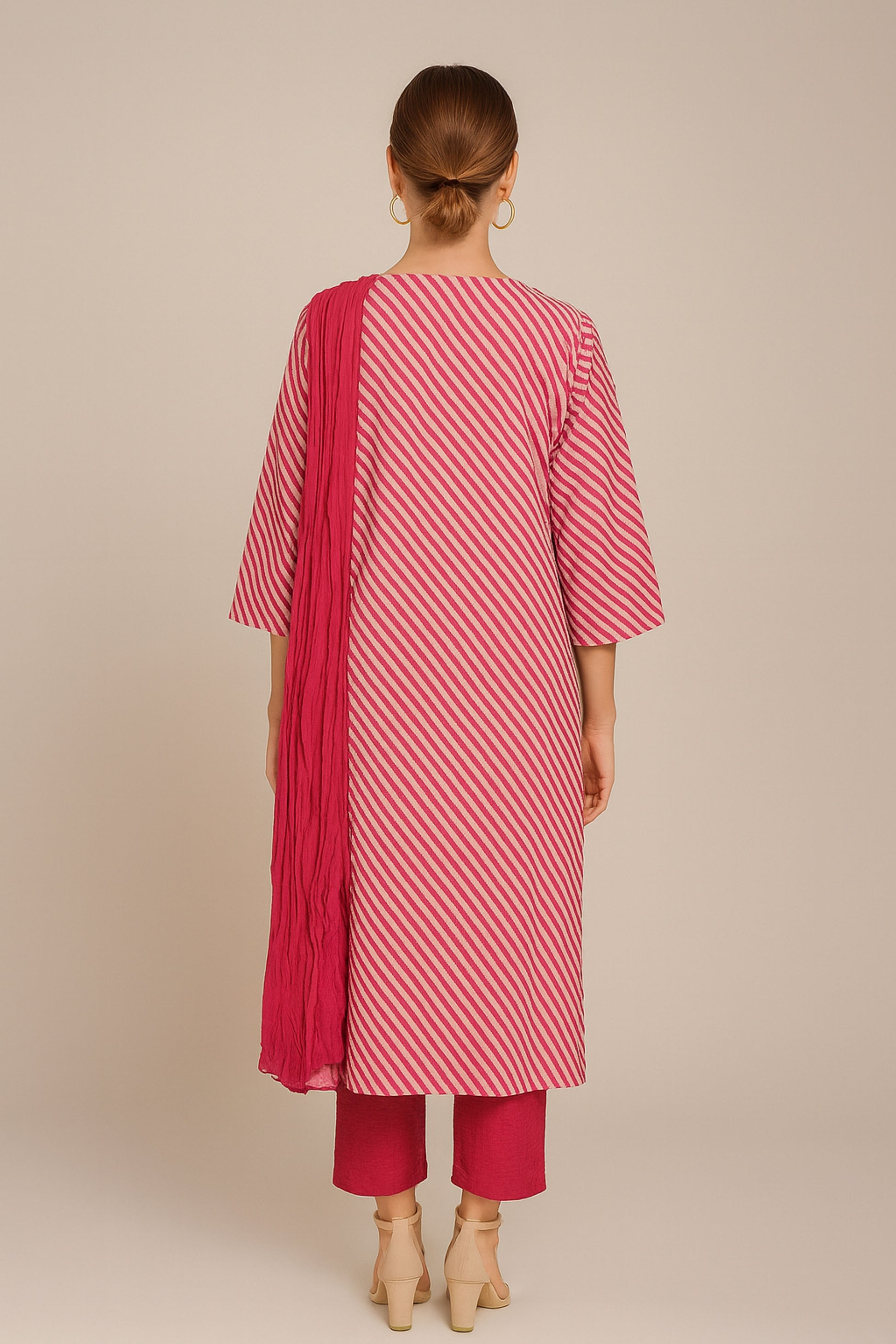 Fuchsia Drift 100% Cotton Diagonal Stripe Kurti Dupatta Set – Casual Chic Ensemble