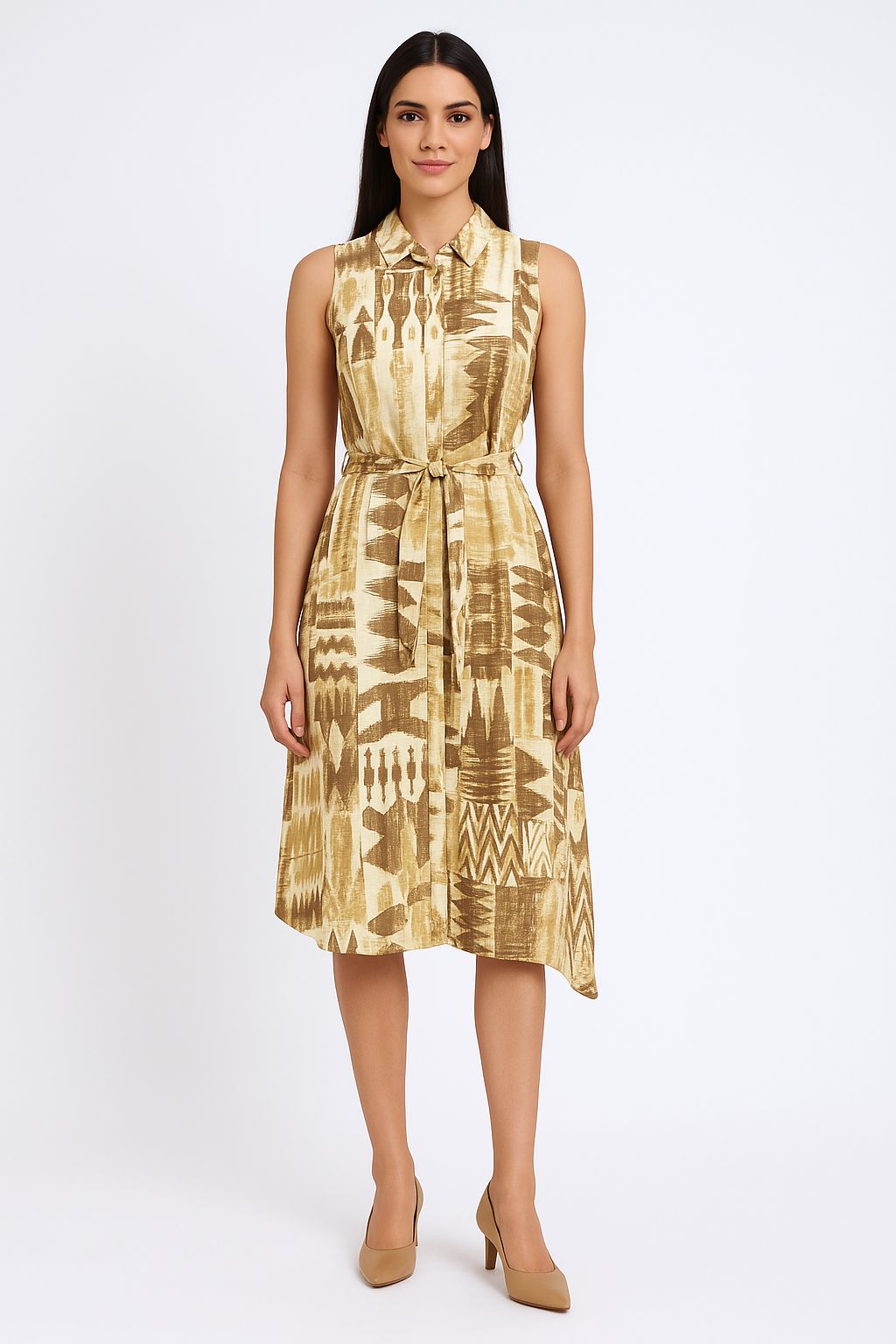 Step into effortless elegance with this Golden Tribal Print Sleeveless Shirt Dress. Crafted from lightweight fabric with a subtle sheen, this dress features a chic shirt collar and a flattering belted waist that defines your silhouette. The earthy tribal-inspired print in warm gold and brown tones adds an artistic edge, making it perfect for brunches, casual outings, or stylish vacations. Pair it with heels or flats to complete the look.