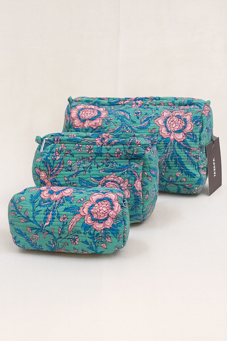 Green Floral Cotton Toiletry Pouch Set of 3 – Handcrafted Travel Makeup & Cosmetic Organizer Bags