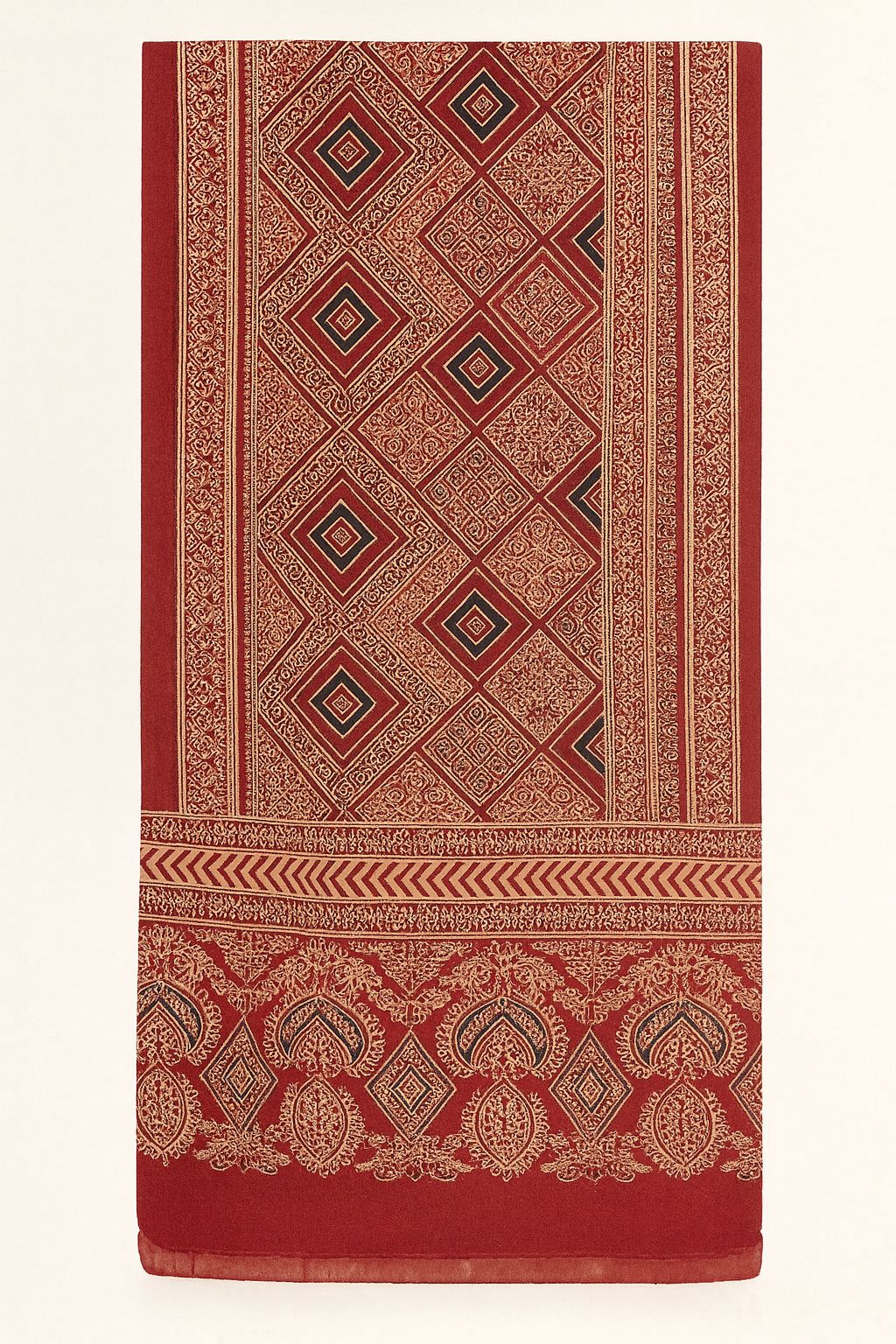 Handcrafted Red Ajrakh Silk Stole | Diamond Geometric Paisley Border & Tassels