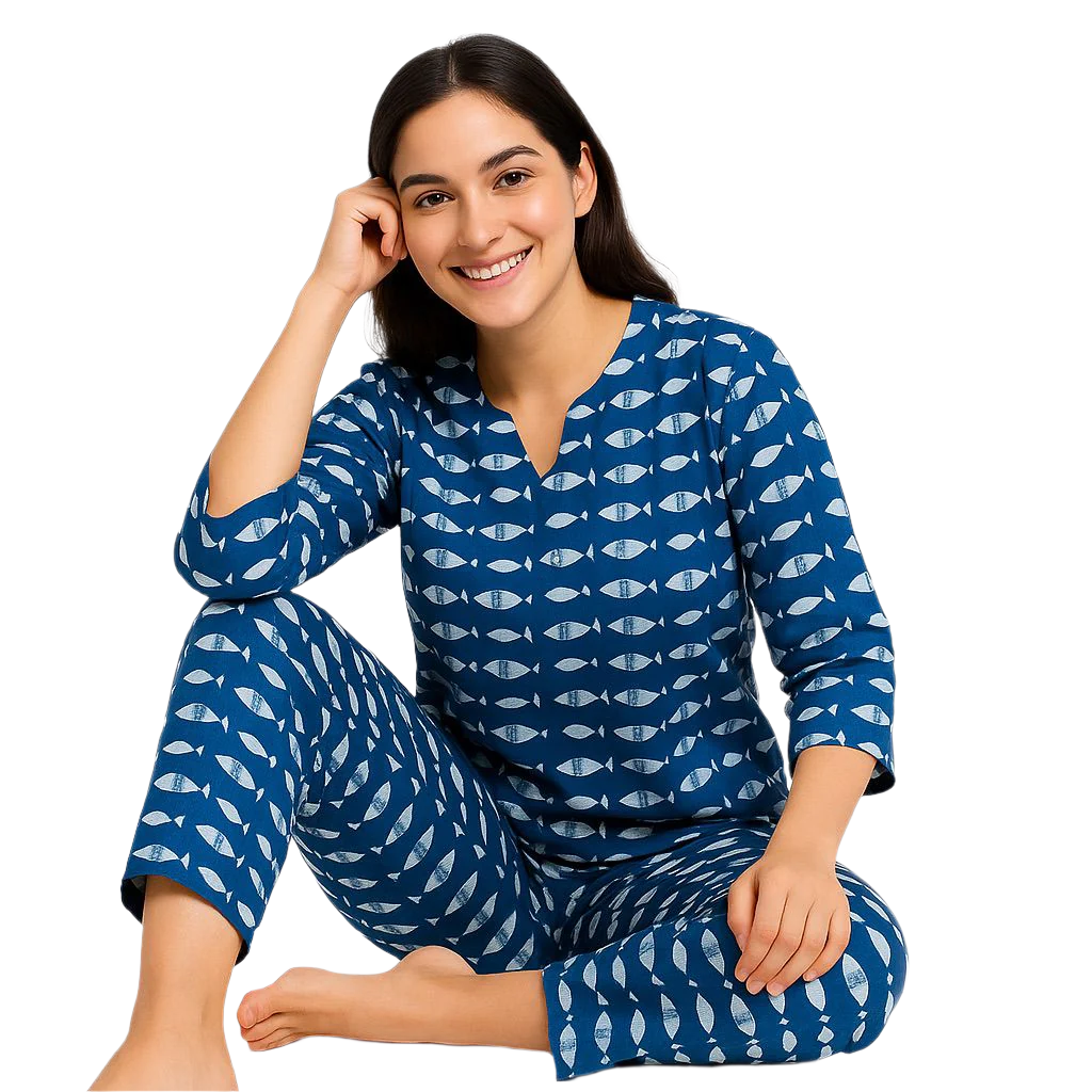 Make comfort your style statement with this vibrant indigo blue co-ord set, featuring a playful fish print. Crafted in soft, breathable cotton, it's perfect for lounging, casual outings, or beachside vibes. The relaxed silhouette and 3/4th sleeves add a touch of effortless charm — just like your mood!