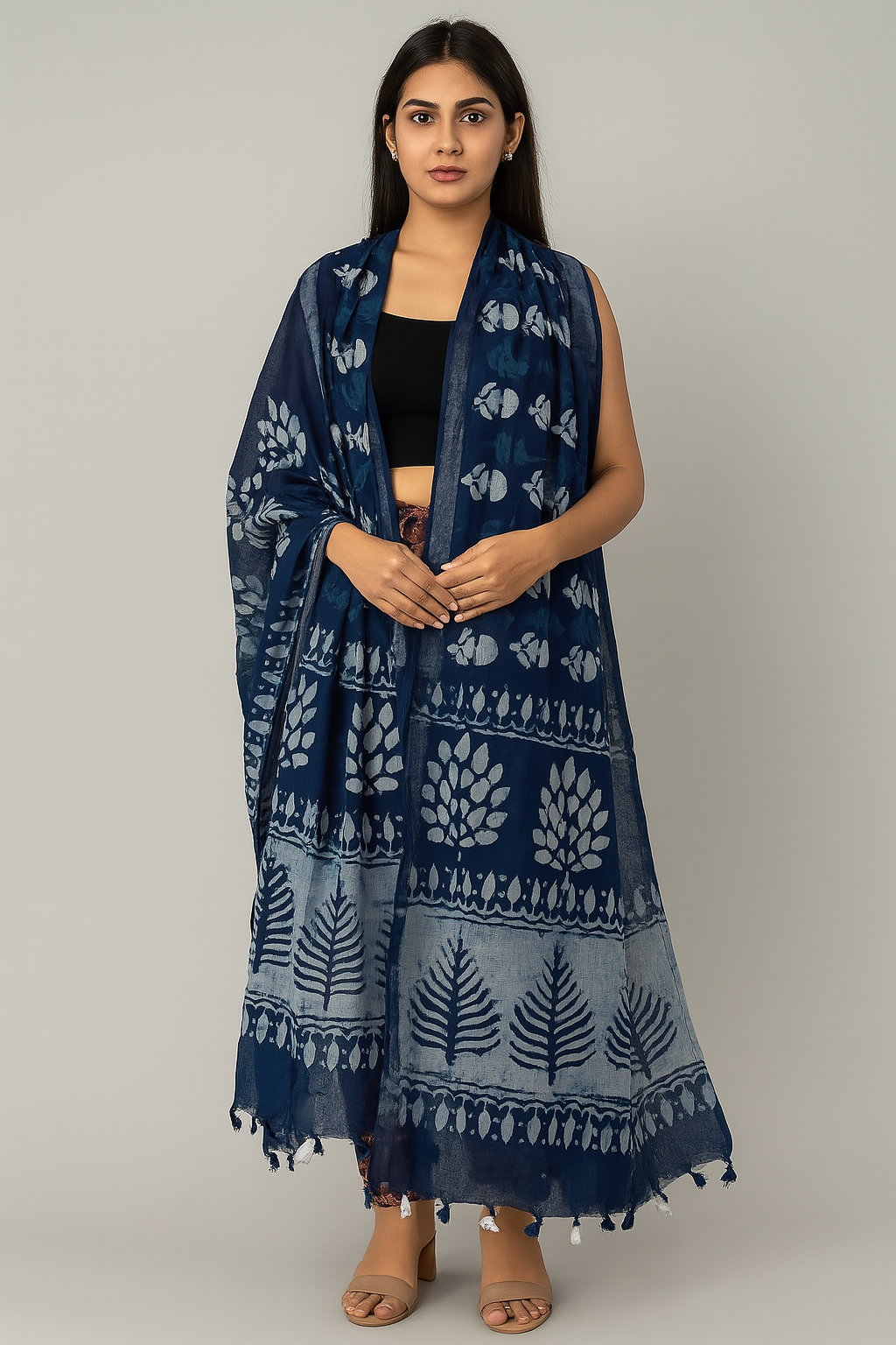Indigo Blue Handblock Cotton Dupatta with Tassels | Ethnic Floral Print | Natural Fab