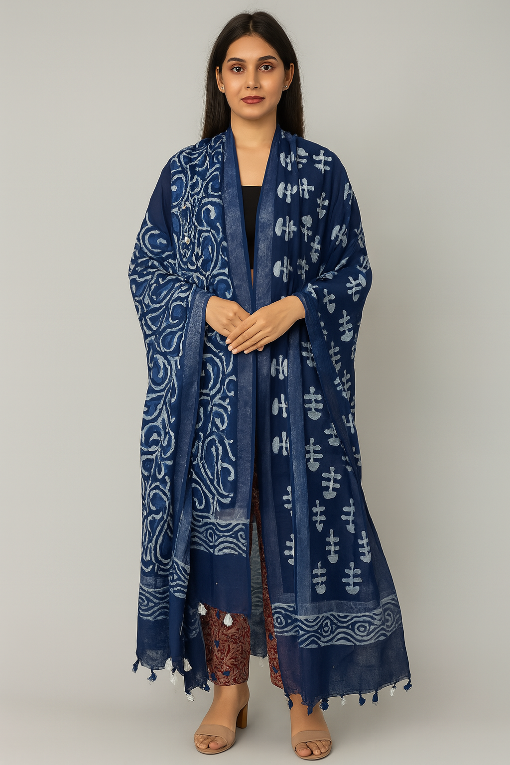Indigo Blue Handblock Printed Cotton Dupatta with Tassels | Dual Pattern Design | Natural Fab