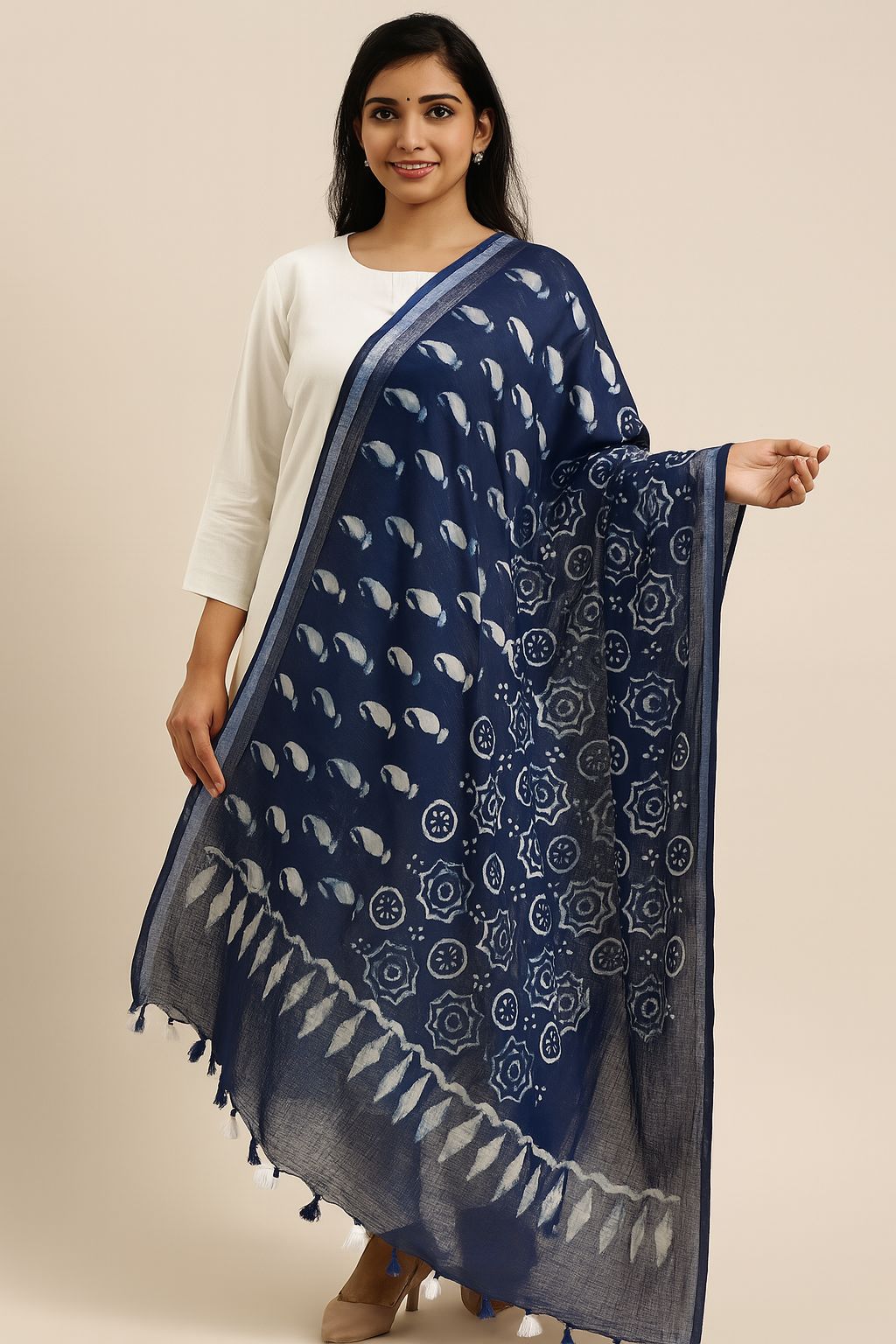 Indigo Dabu Cotton Dupatta with Fish & Mandala Block Prints – Handcrafted Tassel Border