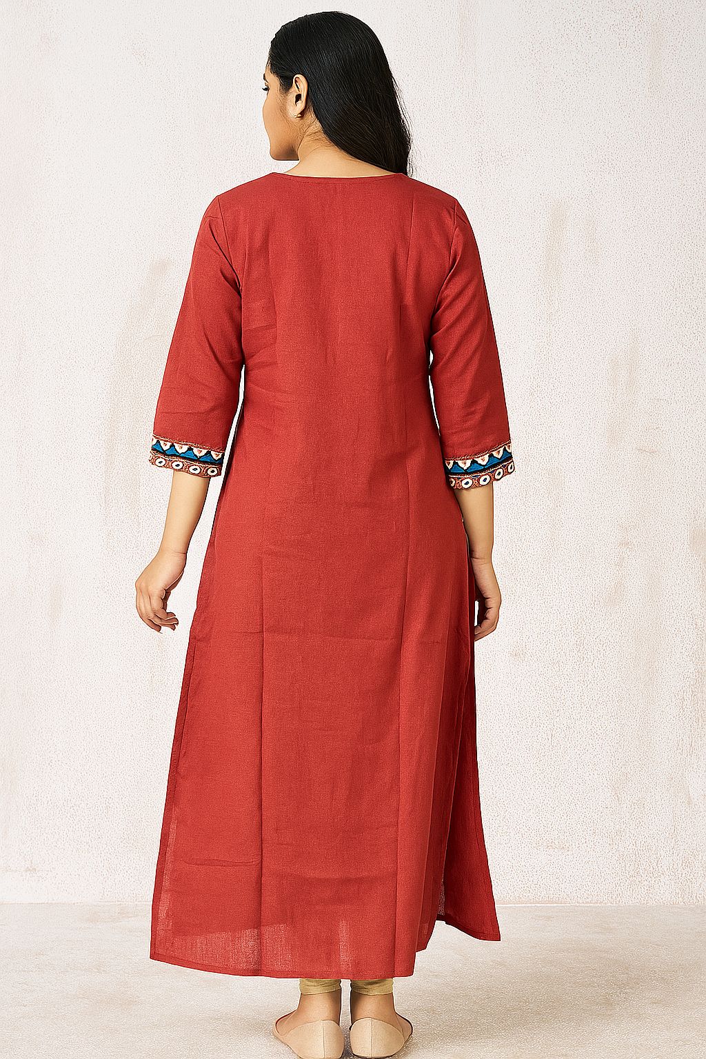 Maroon Cotton A-Line Kurta with Embroidered Yoke & 3/4th Sleeves