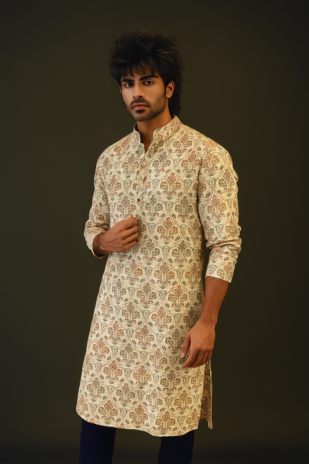 Elevate your ethnic wardrobe with this premium men’s long kurta, crafted from breathable cotton fabric and adorned with intricate handblock-inspired floral motifs. Designed in soothing earthy tones, this kurta offers a perfect blend of comfort, tradition, and modern elegance.