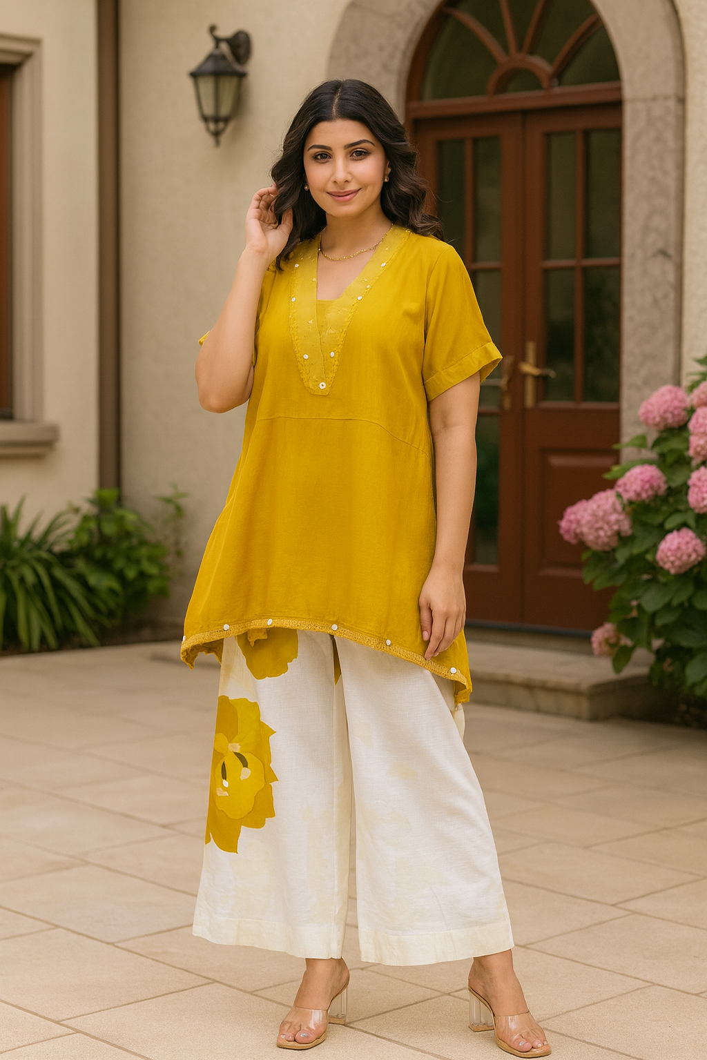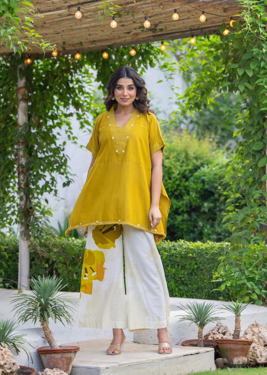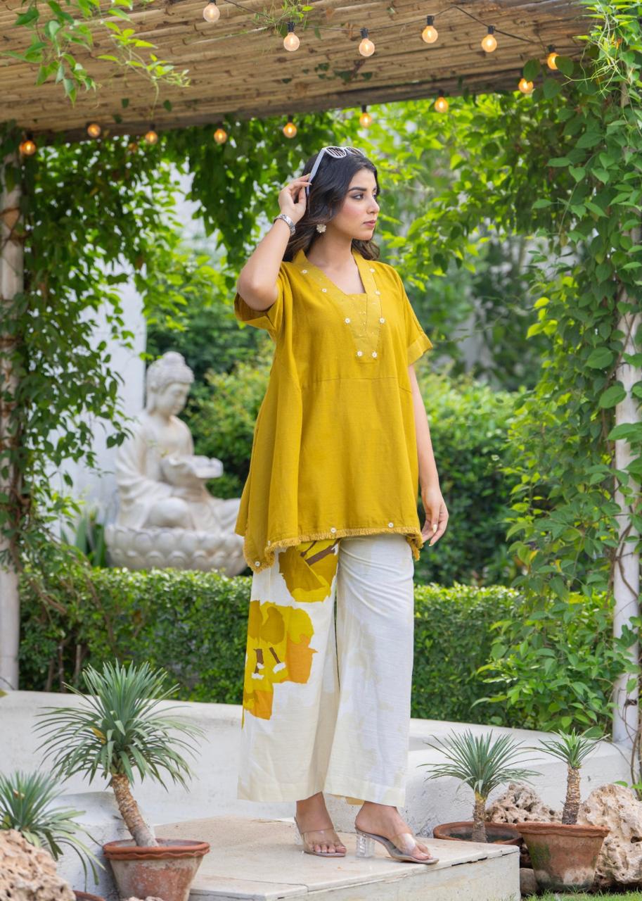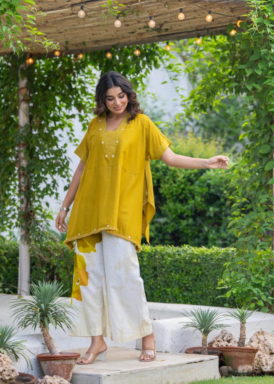 Turn heads in this elegant mustard co-ord set from Natural Fab, crafted in soft, breathable khadi cotton. The hand-embroidered short kurti features a relaxed silhouette with delicate detailing and tassel edges. Paired with ivory wide-leg pants adorned with bold floral prints in mustard hues, this ensemble offers the perfect balance of comfort and contemporary style. Ideal for daytime outings, brunches, or casual festive gatherings.