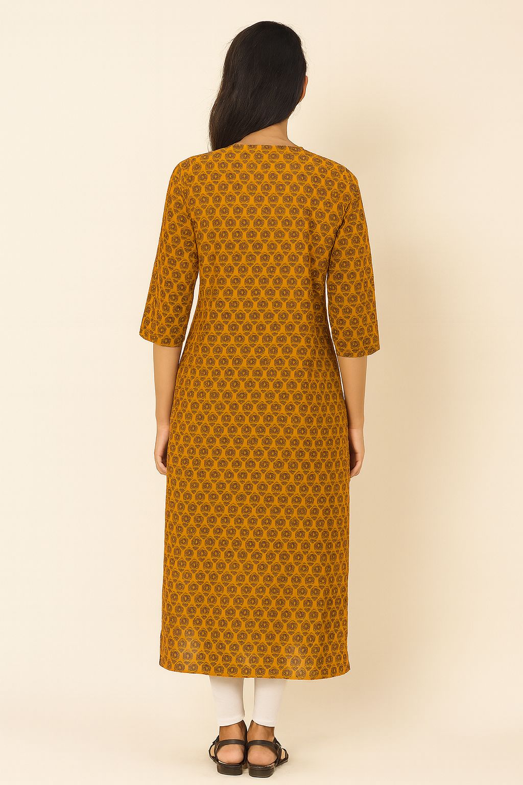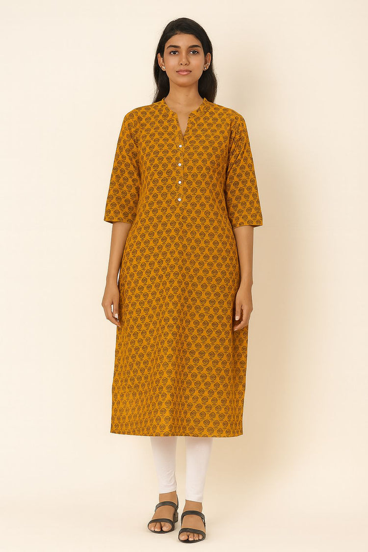 Add charm to your ethnic collection with this mustard yellow cotton printed kurti featuring a classic round neck with button detailing and 3/4th sleeves. Crafted from soft breathable cotton fabric, it ensures comfort while giving you a stylish look. Ideal for daily wear, office wear, college, and casual outings, this kurti pairs beautifully with leggings, palazzos, or jeans. Its timeless hand-block style print adds a traditional yet modern touch, making it a versatile choice for women who love comfortable and elegant ethnic wear.