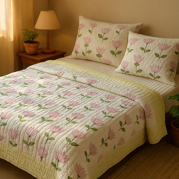 Natural Fab Pink Lotus Handblock Printed Cotton Double Comforter – 3 Layer Quilted AC Quilt, Soft & Breathable Bedding Set