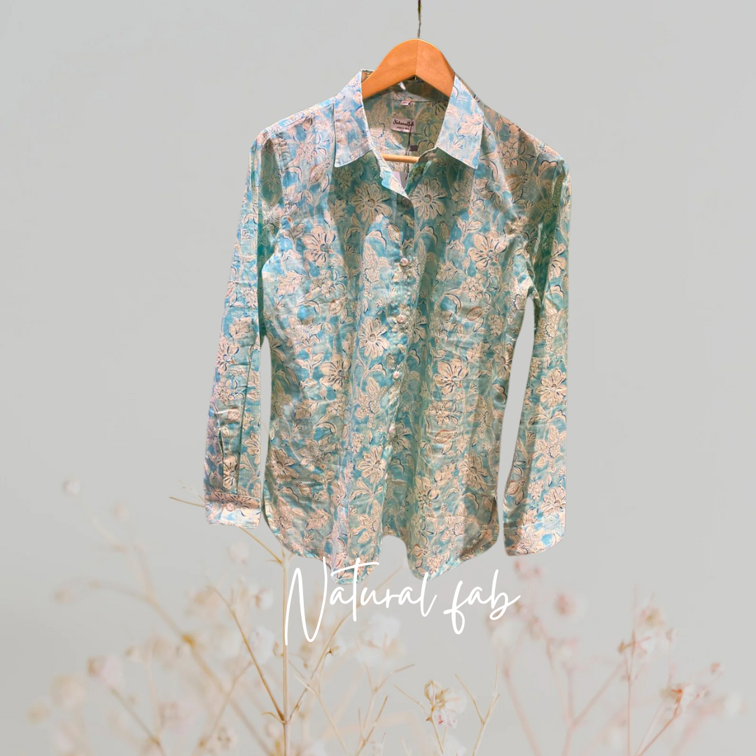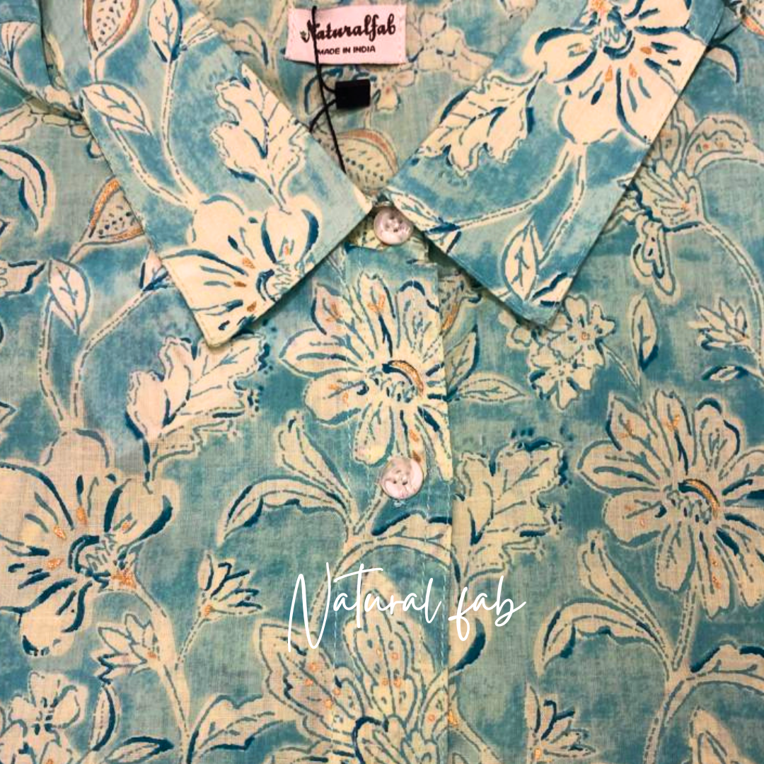 Natural Fab Women's Sky Blue Floral Cotton Shirt – Handblock Printed, Pure Cotton