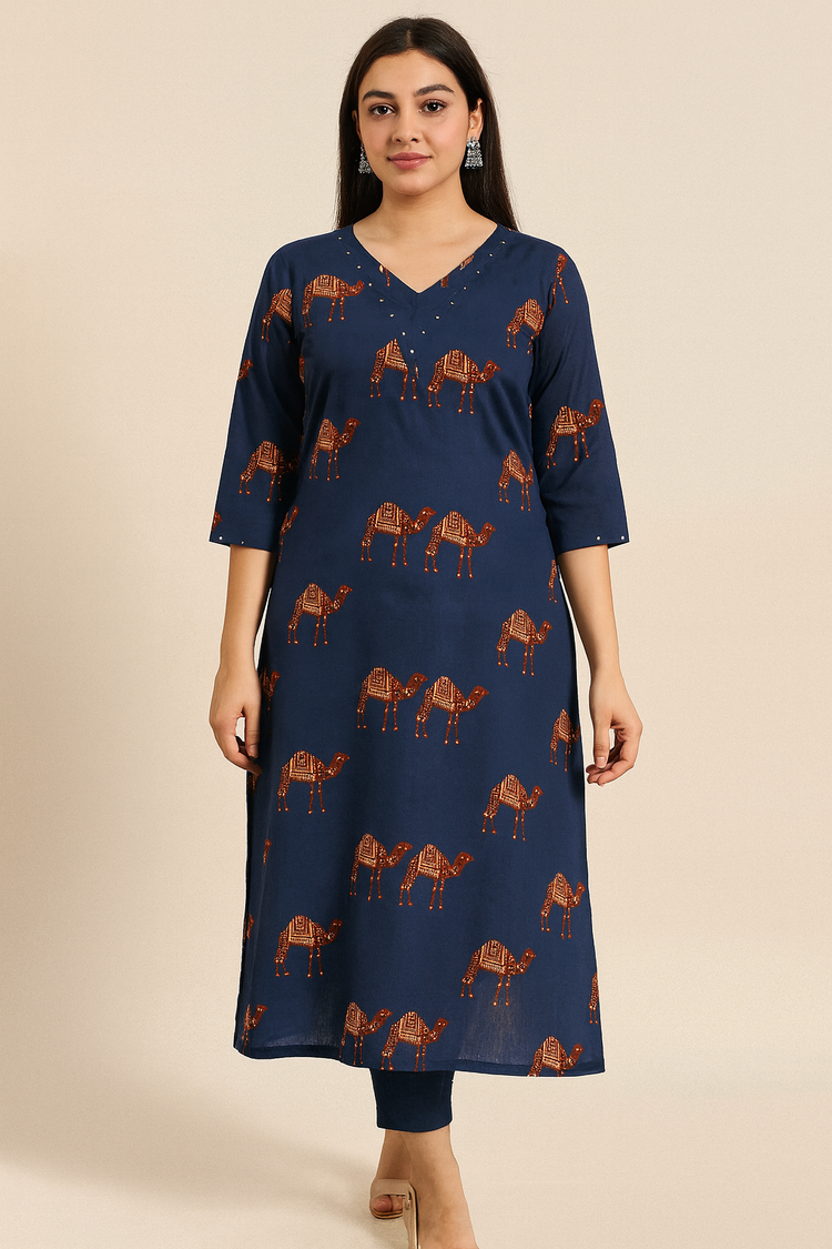 Showcase your love for handcrafted art with this elegant navy blue camel print cotton kurti from Natural Fab. Featuring traditional hand-block inspired camel motifs, this straight-fit kurti is made from soft, breathable cotton that keeps you cool and comfortable all day long. The minimalist V-neck with delicate embellishments adds a touch of sophistication, making it perfect for everyday wear or casual festive outings.