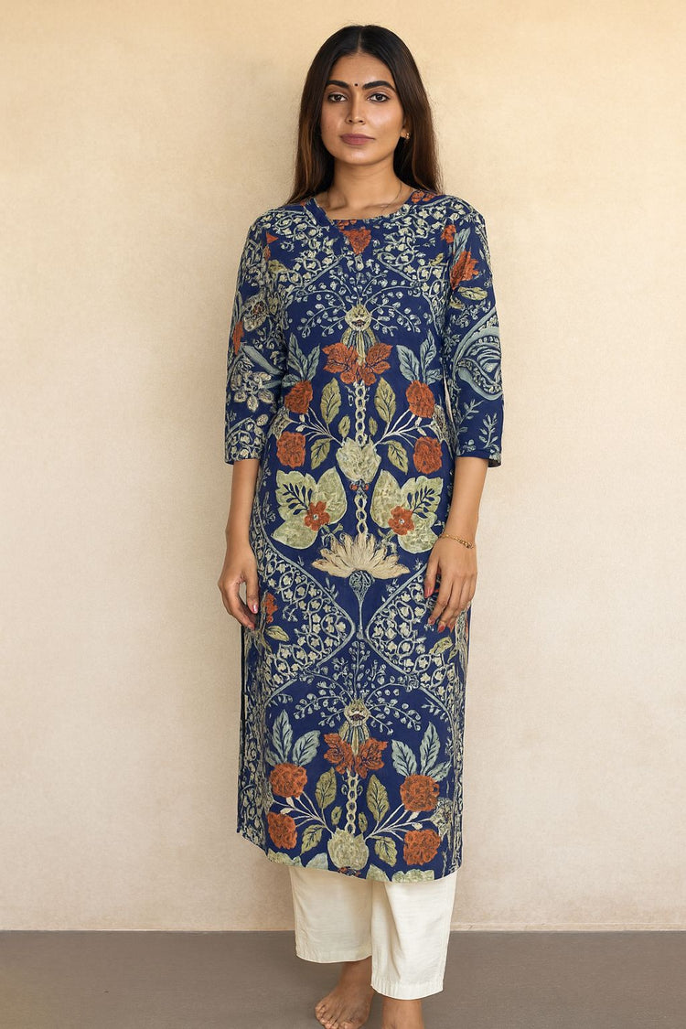 Bring elegance to your wardrobe with this navy blue cotton floral printed kurti featuring intricate multicolor floral motifs, a classic round notch neckline, and 3/4th sleeves. Made from soft breathable cotton, this kurti is perfect for daily wear, office wear, festive occasions, and casual outings. The vibrant floral design adds a touch of traditional charm while maintaining a modern appeal. Pair it with white, beige, or contrasting bottoms for a graceful ethnic look. A must-have for women who love stylish and comfortable cotton kurtis.