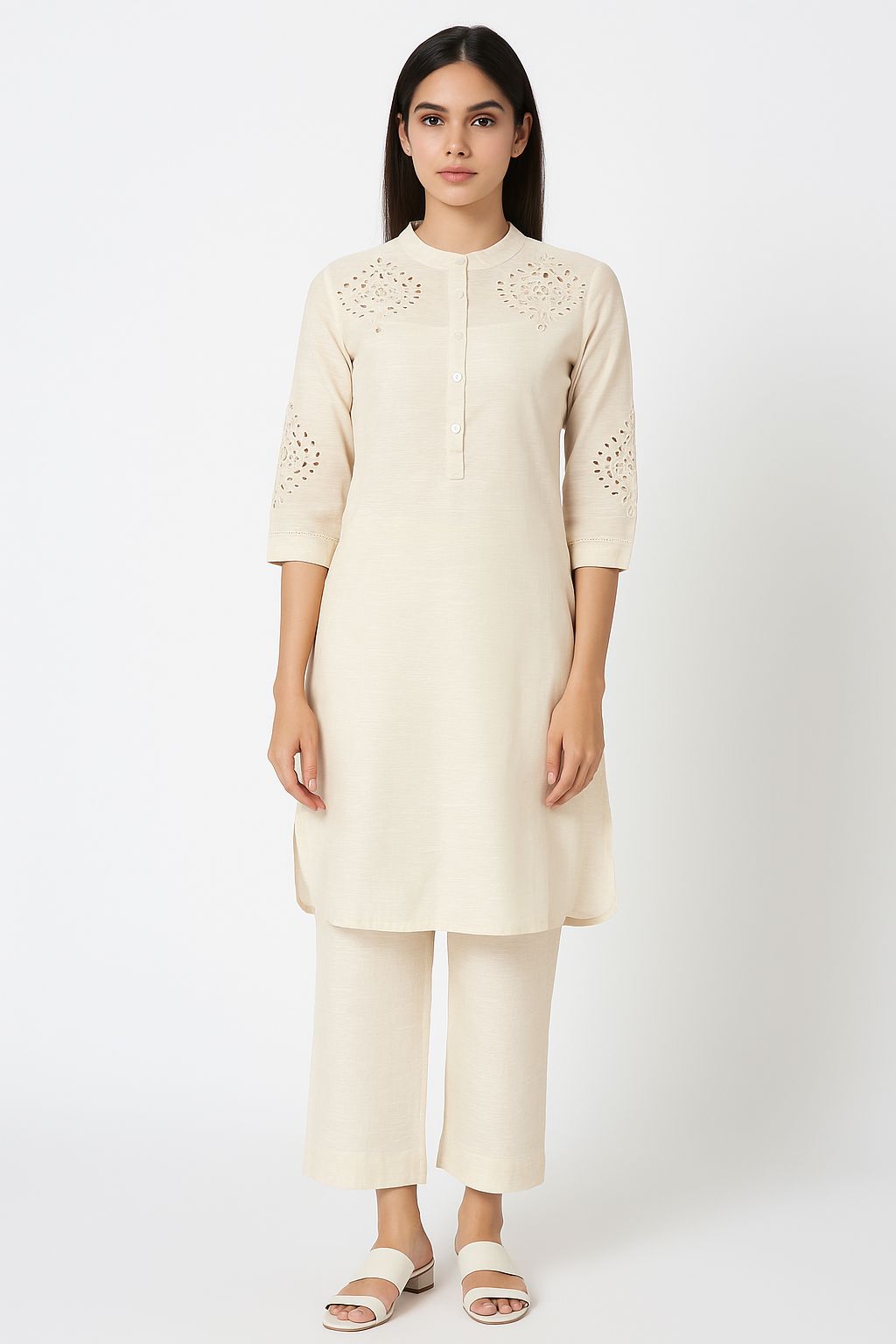 Off-White Cotton Co-ord Set with Schiffli Embroidery