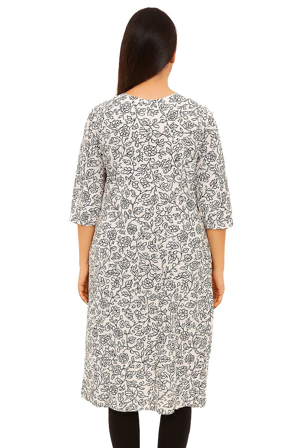 Off-White Cotton Straight Kurti for Women – Black Hand-Drawn Floral Print | V-Neck, 3/4 Sleeves