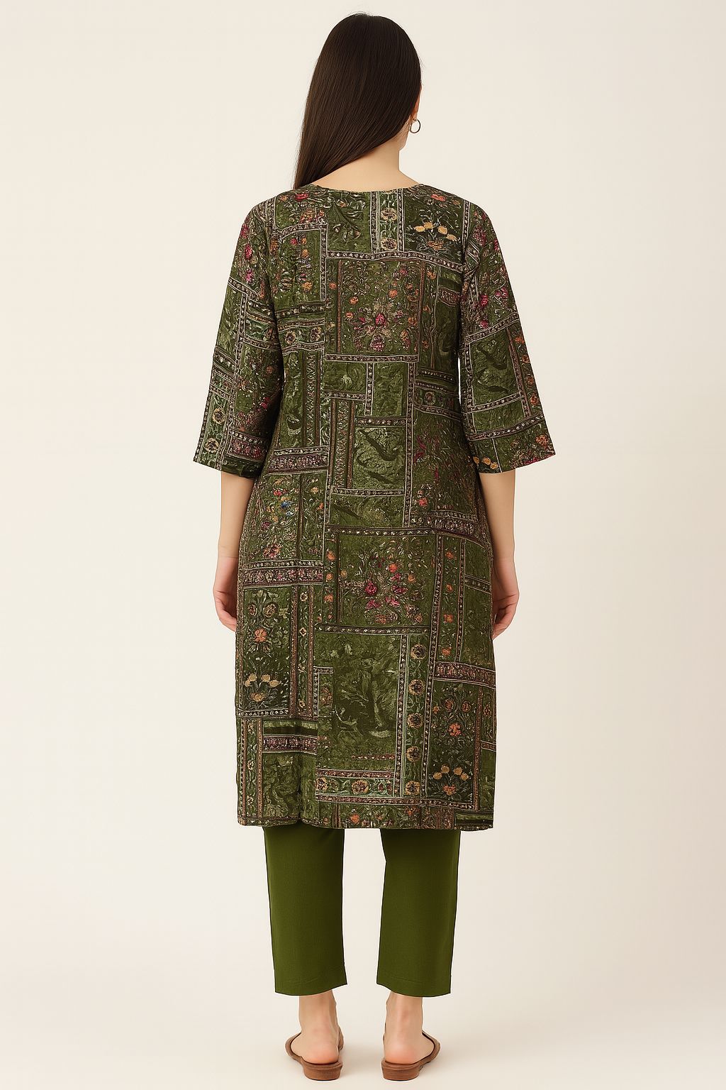 Olive Green Khata Work Cotton Kurti Set with Straight Pants – Natural Fab