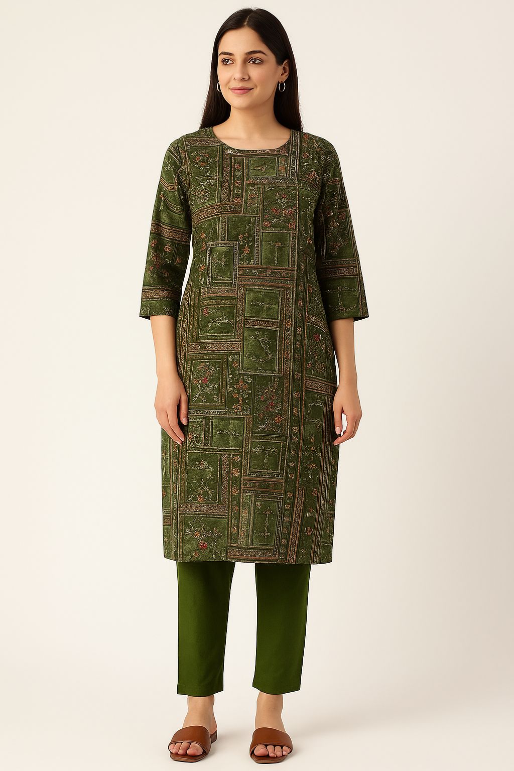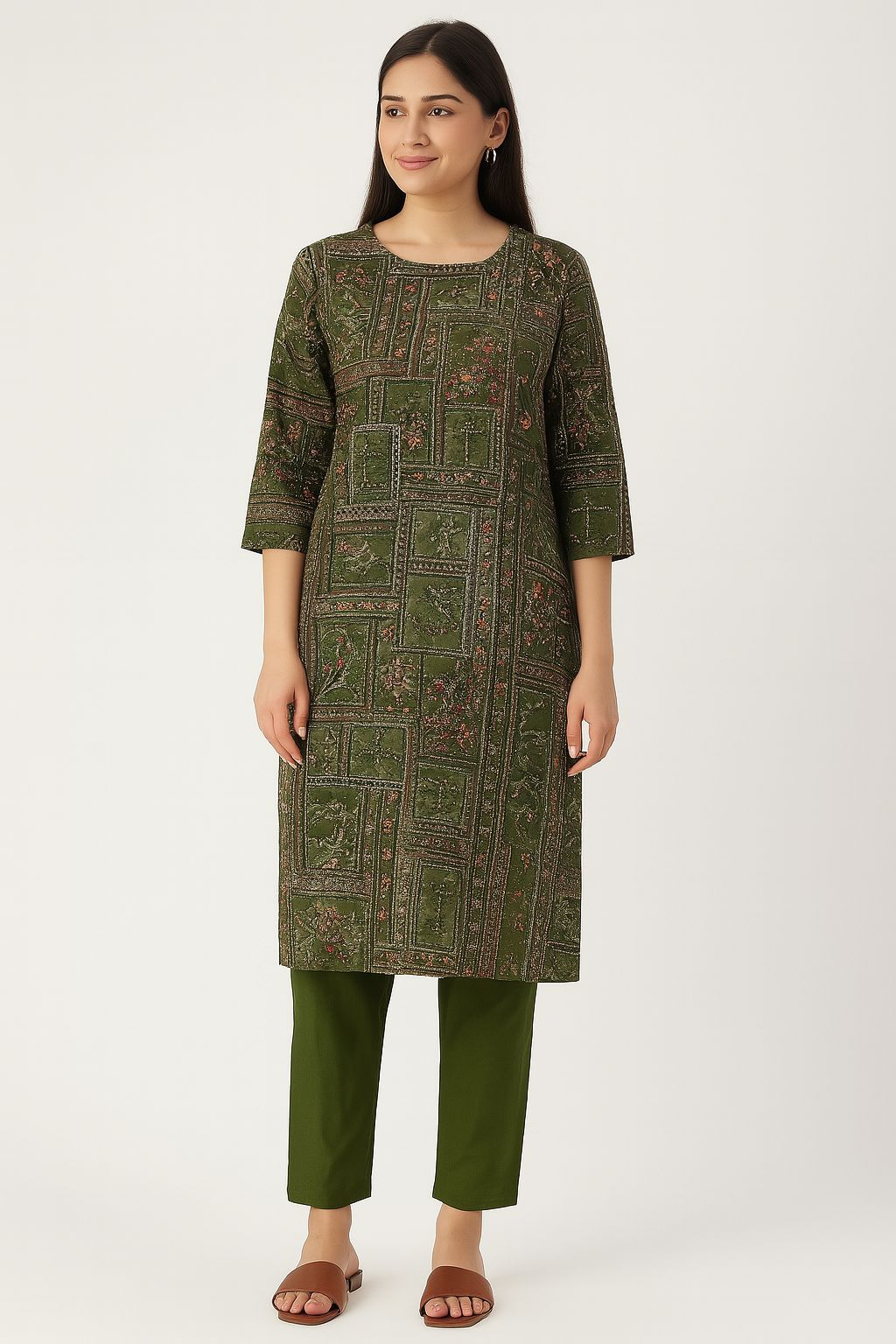 Bring timeless charm to your wardrobe with this olive green khata work kurti set from Natural Fab. Made from breathable cotton, the kurti features a beautifully structured panel-style khata stitch design with subtle floral accents. Paired with matching solid olive straight-fit pants, this elegant set is perfect for office wear, casual gatherings, or everyday comfort with a touch of ethnic flair.