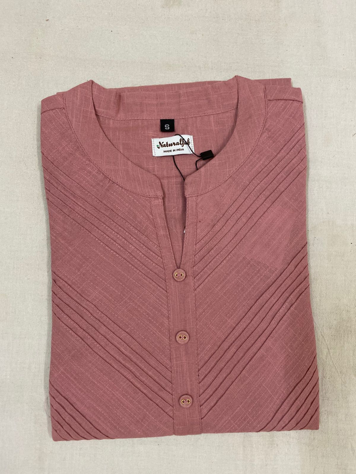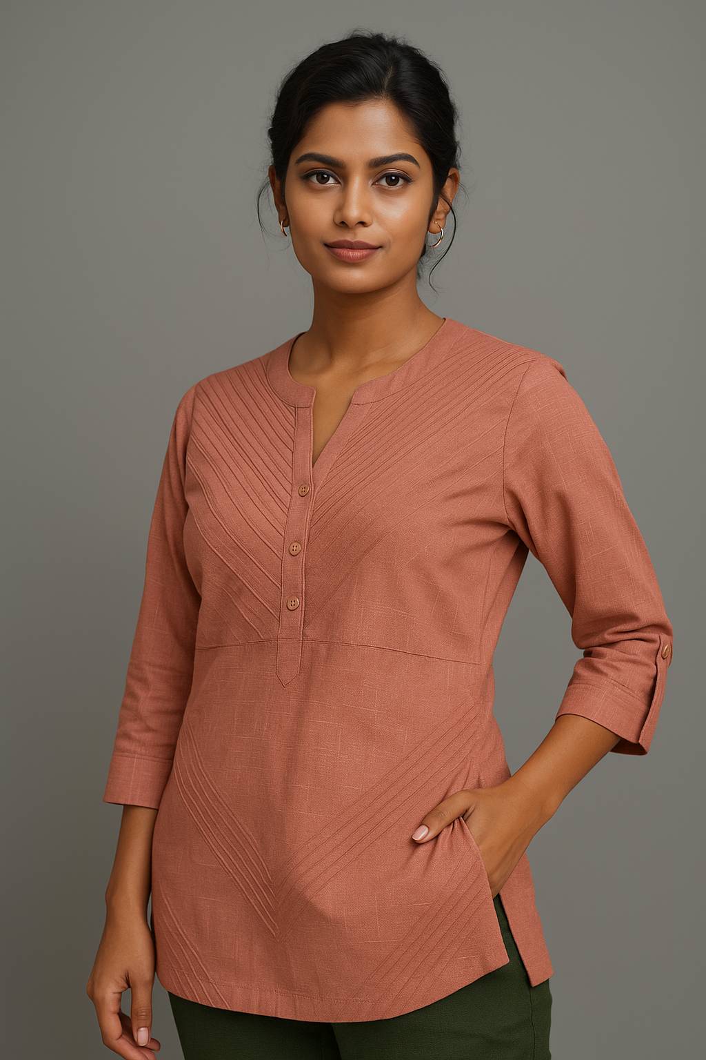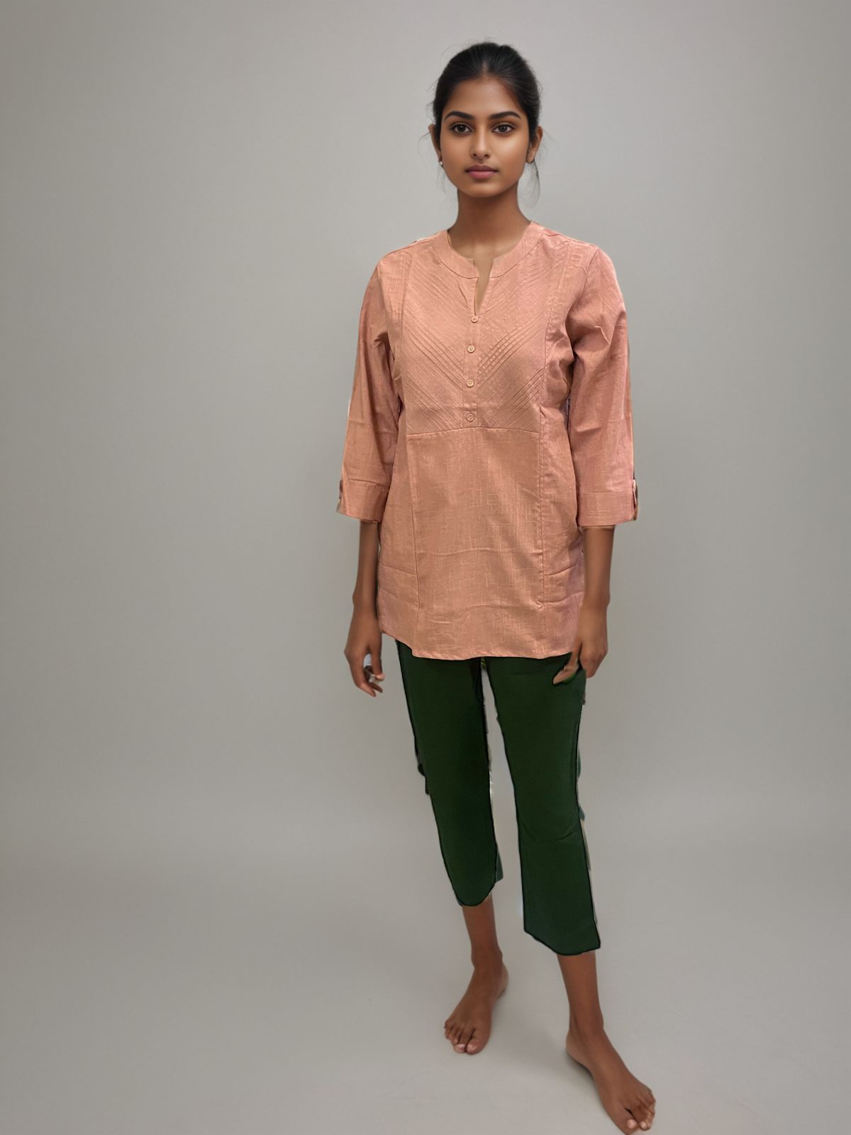 Step into effortless elegance with this peach short kurti, designed for the modern woman who values both comfort and style. Its subtle textured weave and buttoned front add minimal yet stylish detailing perfect for casual, work, or day-to-day wear.