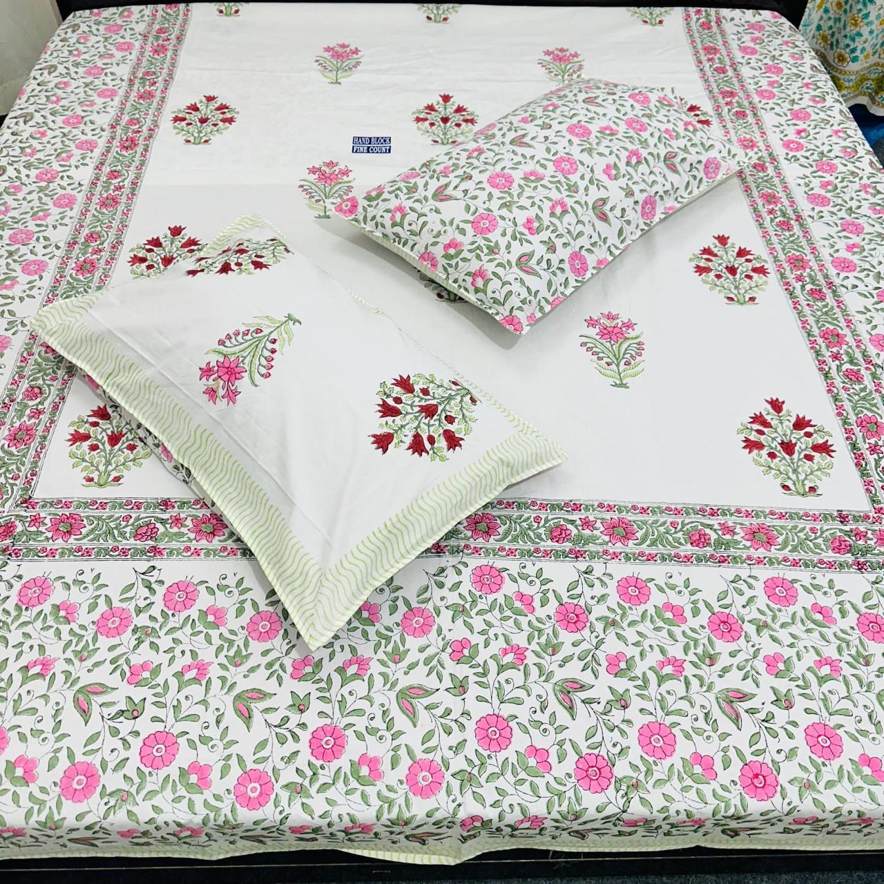 Premium Cotton Bedsheet – Fine Count Handblock Print in Pastel Pink & Green