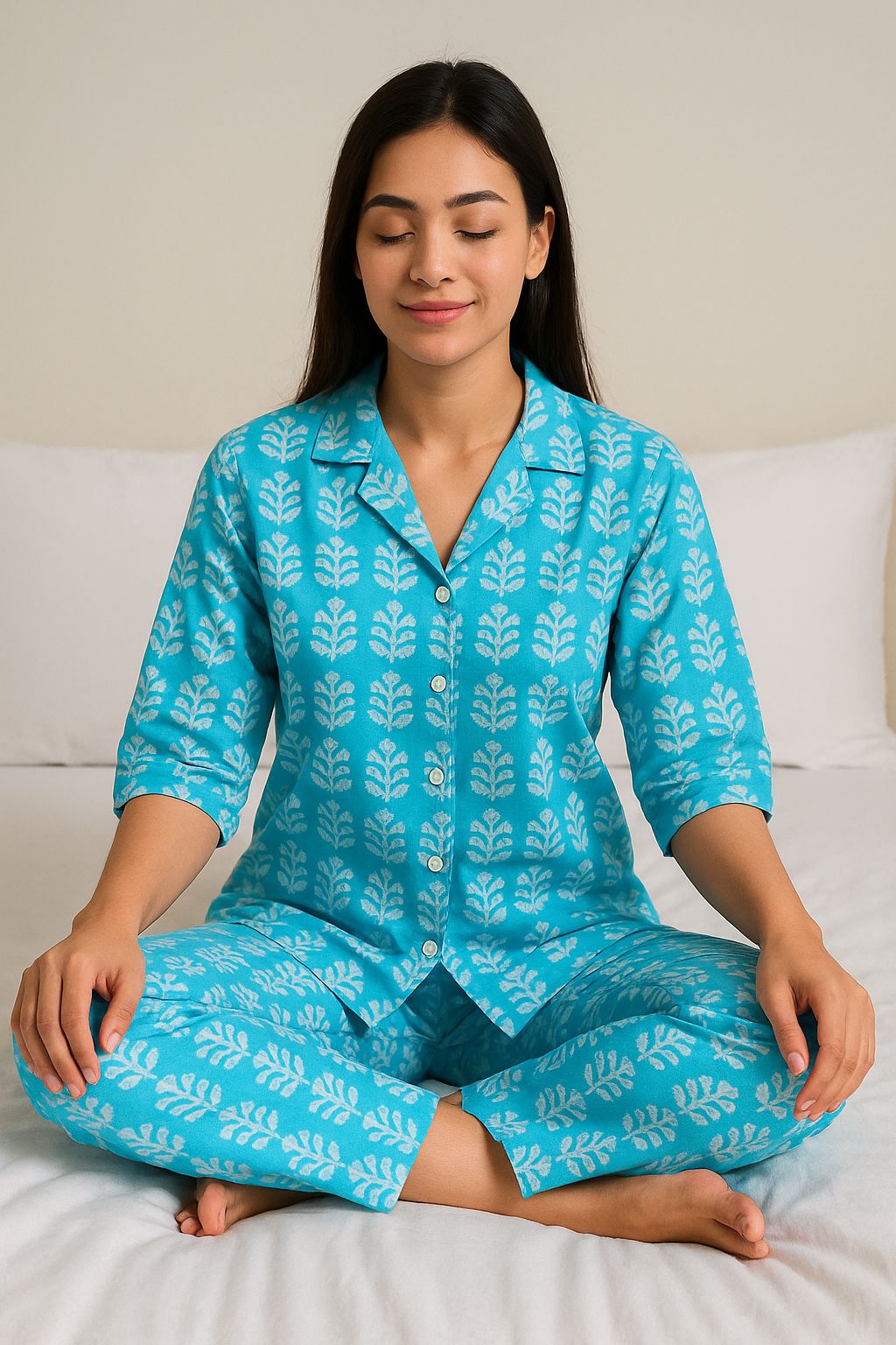 Upgrade your sleepwear with this elegant women’s cotton night suit set in soothing sky blue. Designed with soft, breathable fabric and delicate all-over prints, it ensures ultimate comfort and style for lounging or sleeping. Featuring a button-down top with 3/4th sleeves and straight-fit pants, this nightwear combines modern design with traditional block print charm. Perfect for cozy nights, relaxing weekends, or as a thoughtful gift, this cotton night suit promises both comfort and durability for everyday wear.