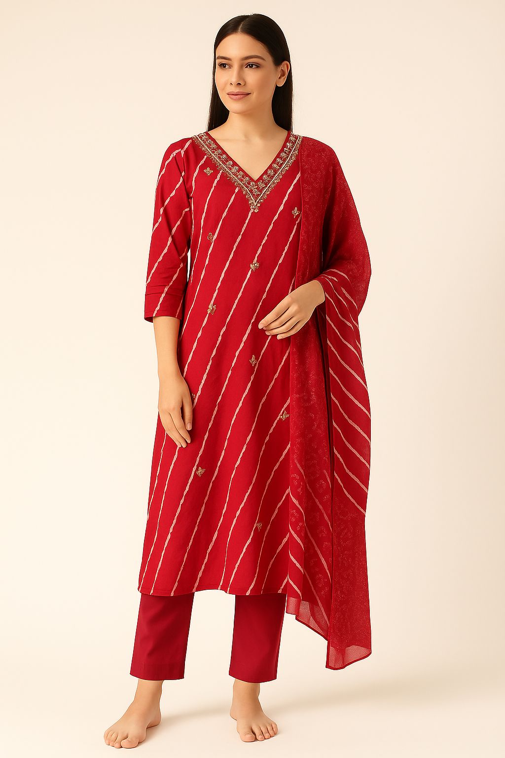 Elevate your ethnic wardrobe with this stunning red kurti set featuring a Bandhej-inspired print and intricate embroidery on the neckline. Crafted from soft cotton blend fabric, the set includes a straight-fit kurti with 3/4th sleeves, solid matching pants, and a beautifully coordinated dupatta with subtle prints and diagonal stripes. The V-neck embroidered yoke adds a festive flair, making it perfect for celebrations, workwear, or day functions.