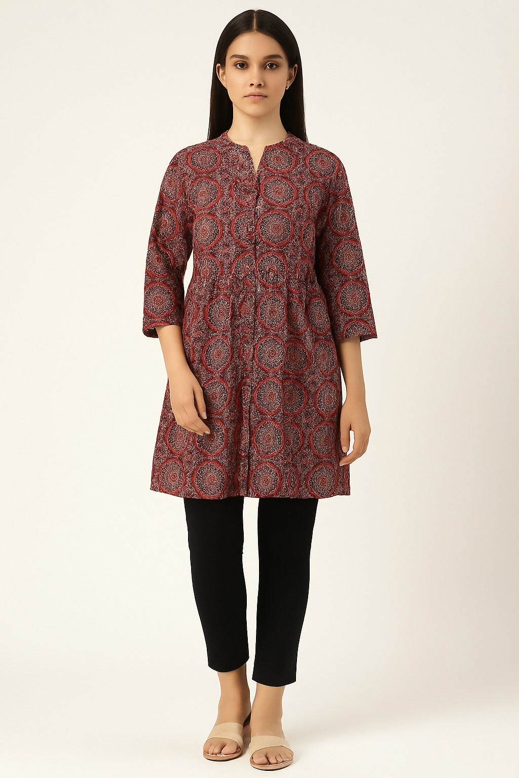 Add a burst of color and culture to your everyday wardrobe with this beautifully handcrafted red cotton kurti by Natural Fab. Made from soft breathable cotton, this short kurta features intricate hand block prints in a symmetrical floral mandala pattern, delivering ethnic charm with modern comfort. The straight-fit silhouette, three-quarter sleeves, and pleated waist design make it a perfect choice for casual outings, office wear, or festive gatherings. Pair it effortlessly with jeans, leggings, or straight pants for a stylish Indo-western look.