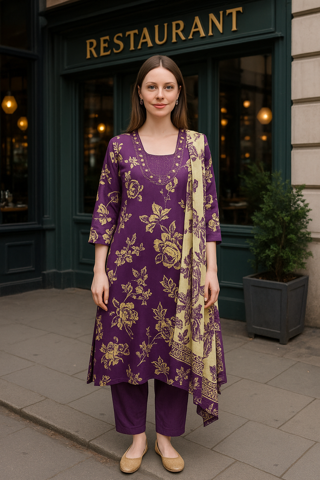 Step into effortless elegance with our Royal Bloom Kurta Set, featuring a majestic purple base adorned with intricate floral prints in soft cream hues. Crafted from lightweight and breathable fabric, this set includes a straight-cut kurta with graceful embroidery at the neckline, a complementing printed dupatta, and matching pants. Whether it’s a festive gathering, family occasion, or casual celebration — this ensemble radiates charm, poise, and comfort all in one.