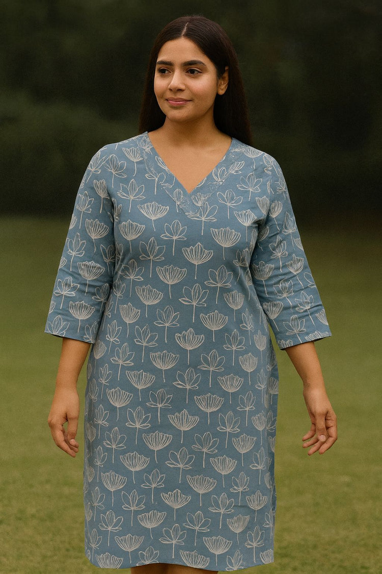 Sky Blue Cotton Kurti with White Lotus Print for Everyday Wear – Natural Fab
