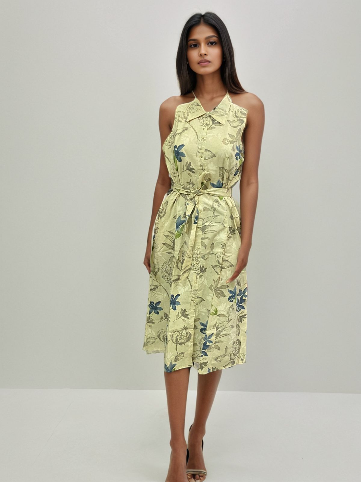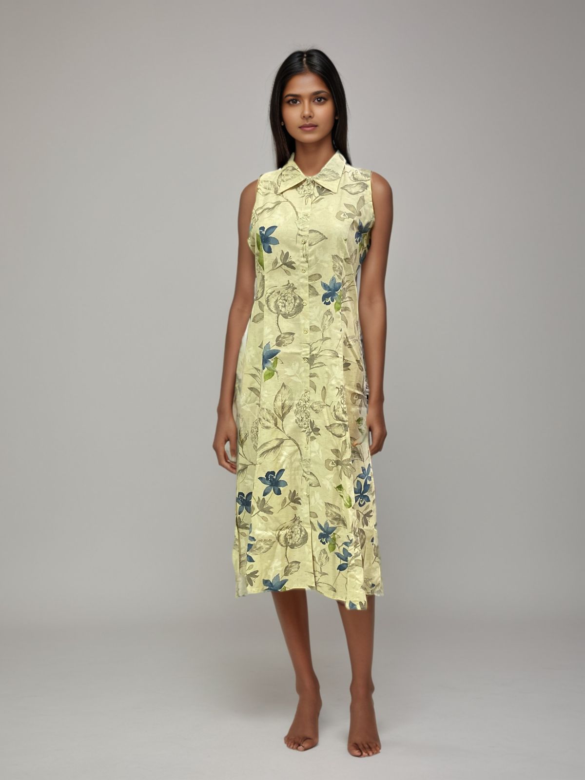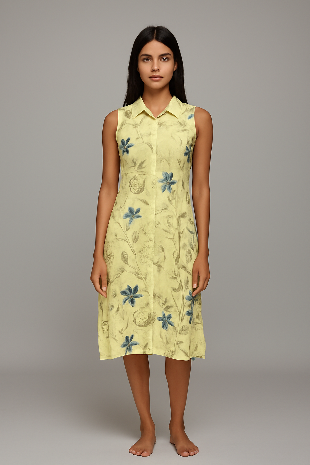 Add a fresh touch to your wardrobe with this elegant sleeveless midi dress in a soft lemon yellow tone. Featuring a structured shirt collar and a flattering A-line silhouette, this dress is perfect for both casual outings and semi-formal gatherings.