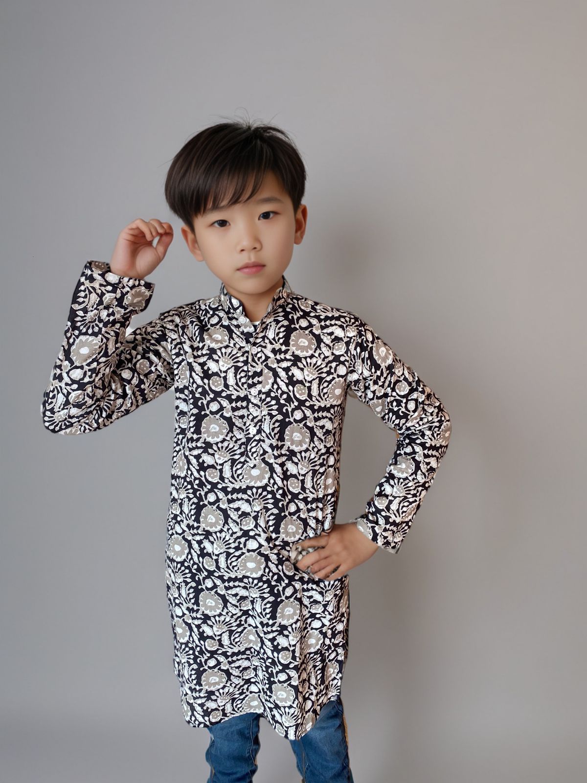 Add a touch of elegance to your child's wardrobe with this stylish floral-printed kurta. Crafted from premium-quality, breathable fabric, it ensures all-day comfort while keeping your little one looking sharp. The intricate black and white floral design creates a classic and timeless look, perfect for festive occasions, family gatherings, or cultural events.