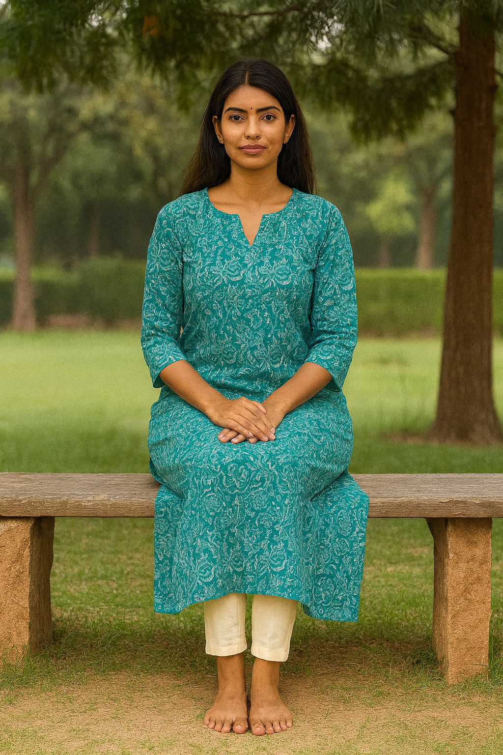 Teal Blue Cotton Printed Kurti for Women – Elegant Floral Ethnic Daily Wear