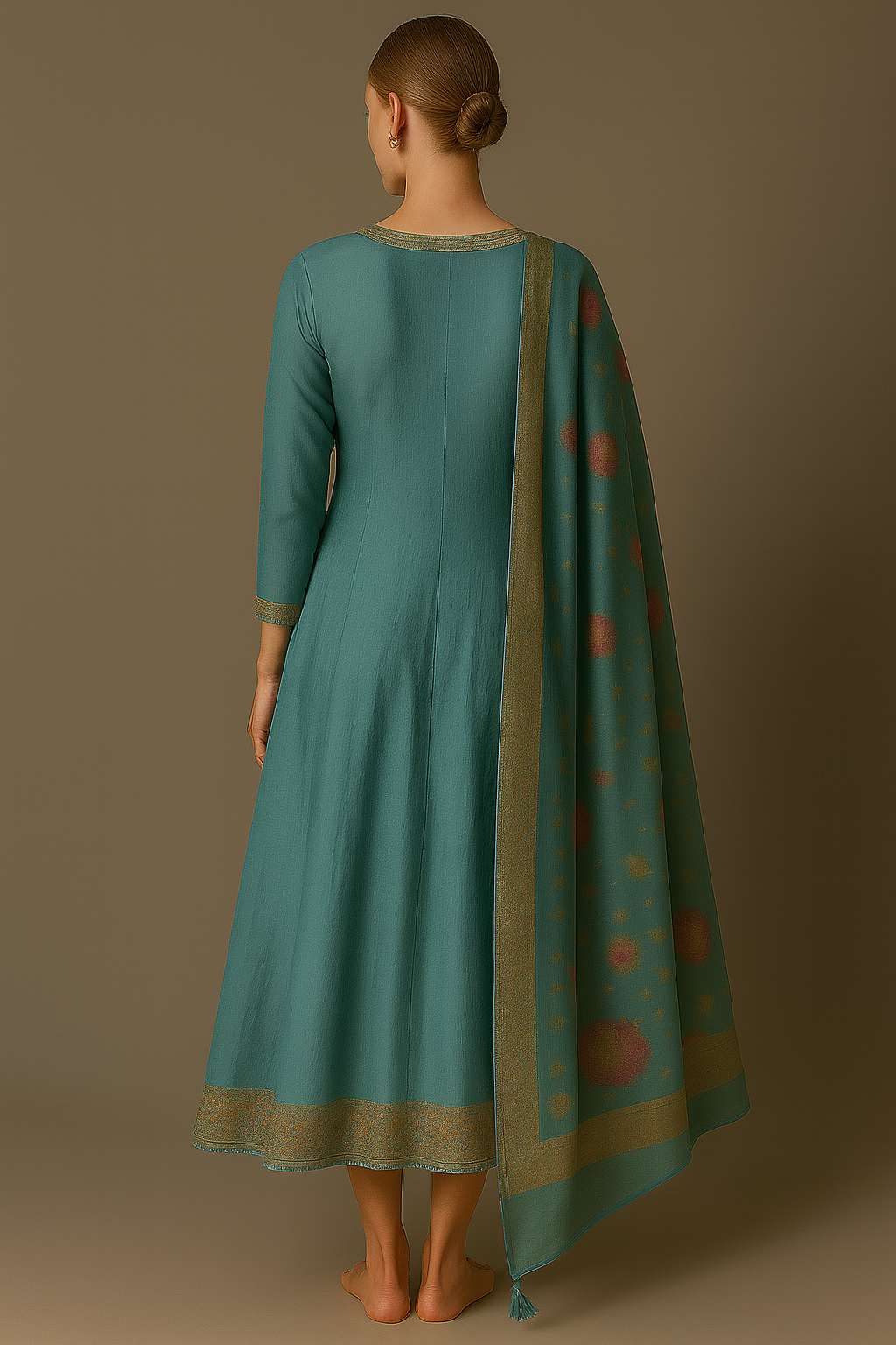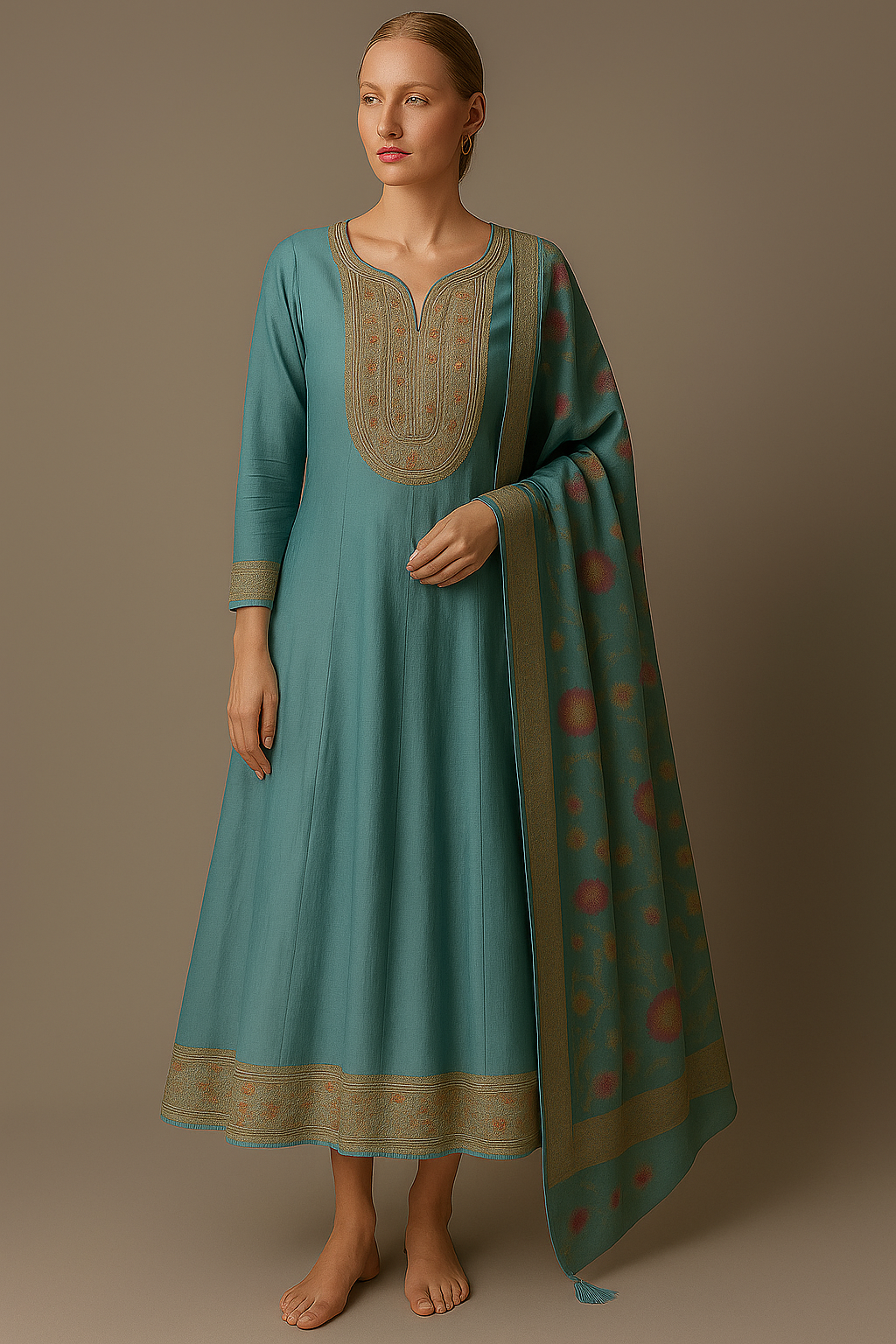Elevate your festive wardrobe with this elegant teal blue ethnic long dress for women, crafted with a flattering A-line silhouette and adorned with a delicately embroidered yoke. The neckline features intricate detailing that adds sophistication, while the woven borders at the cuffs and hemline enhance its traditional charm. Styled with a matching dupatta featuring subtle ethnic motifs, this outfit blends timeless grace with modern appeal.