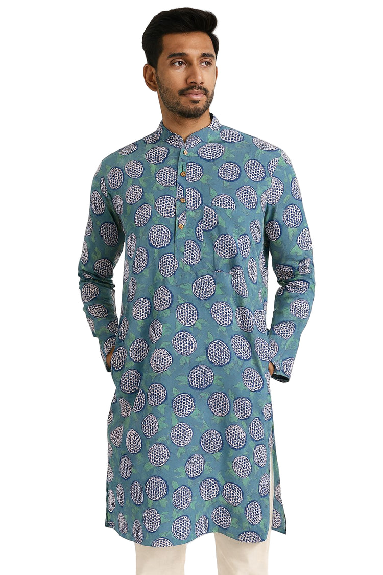 Teal Blue Hand Block Printed Cotton Men’s Knee Length Kurta | Traditional Ethnic Wear by Natural Fab