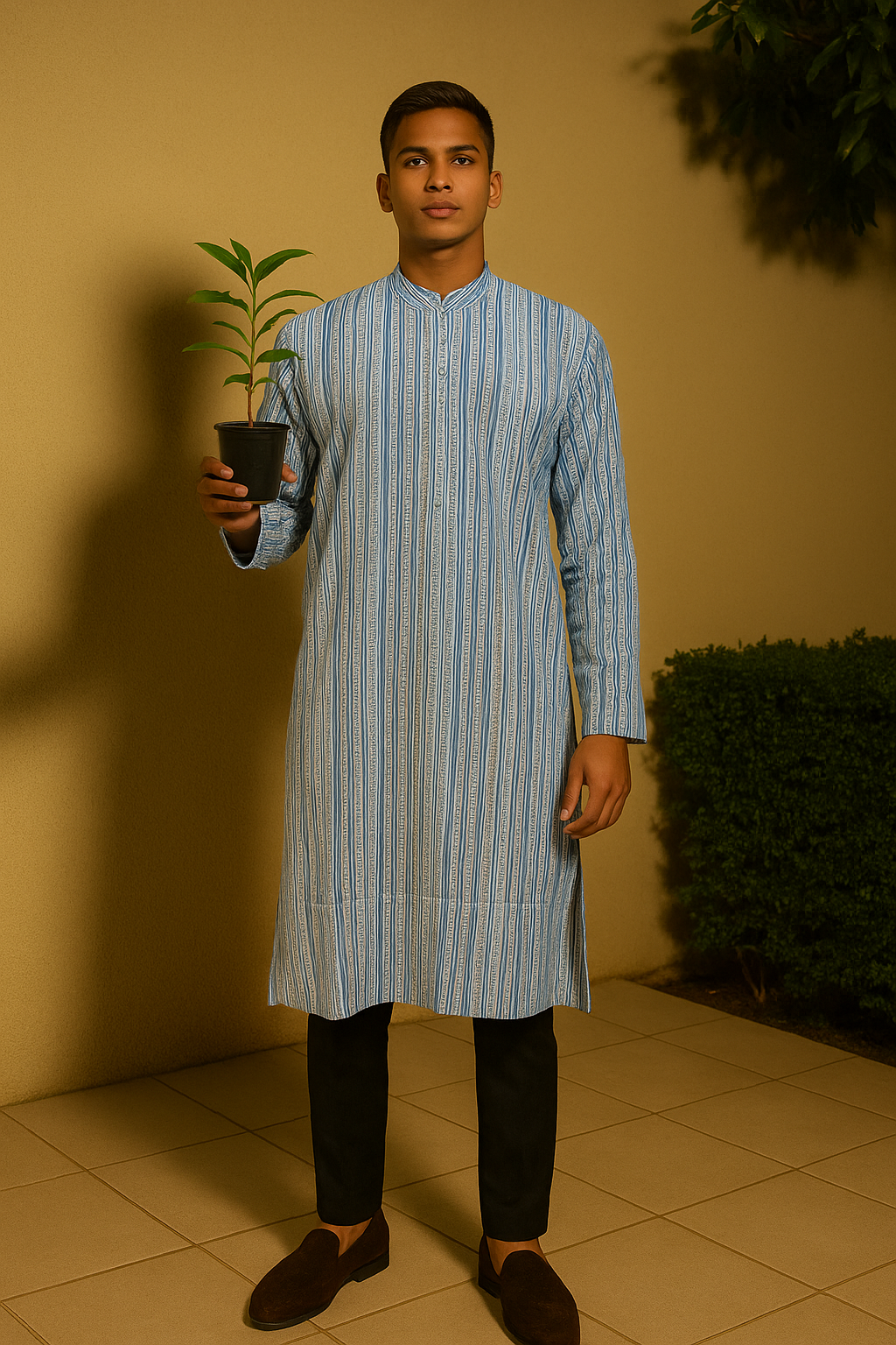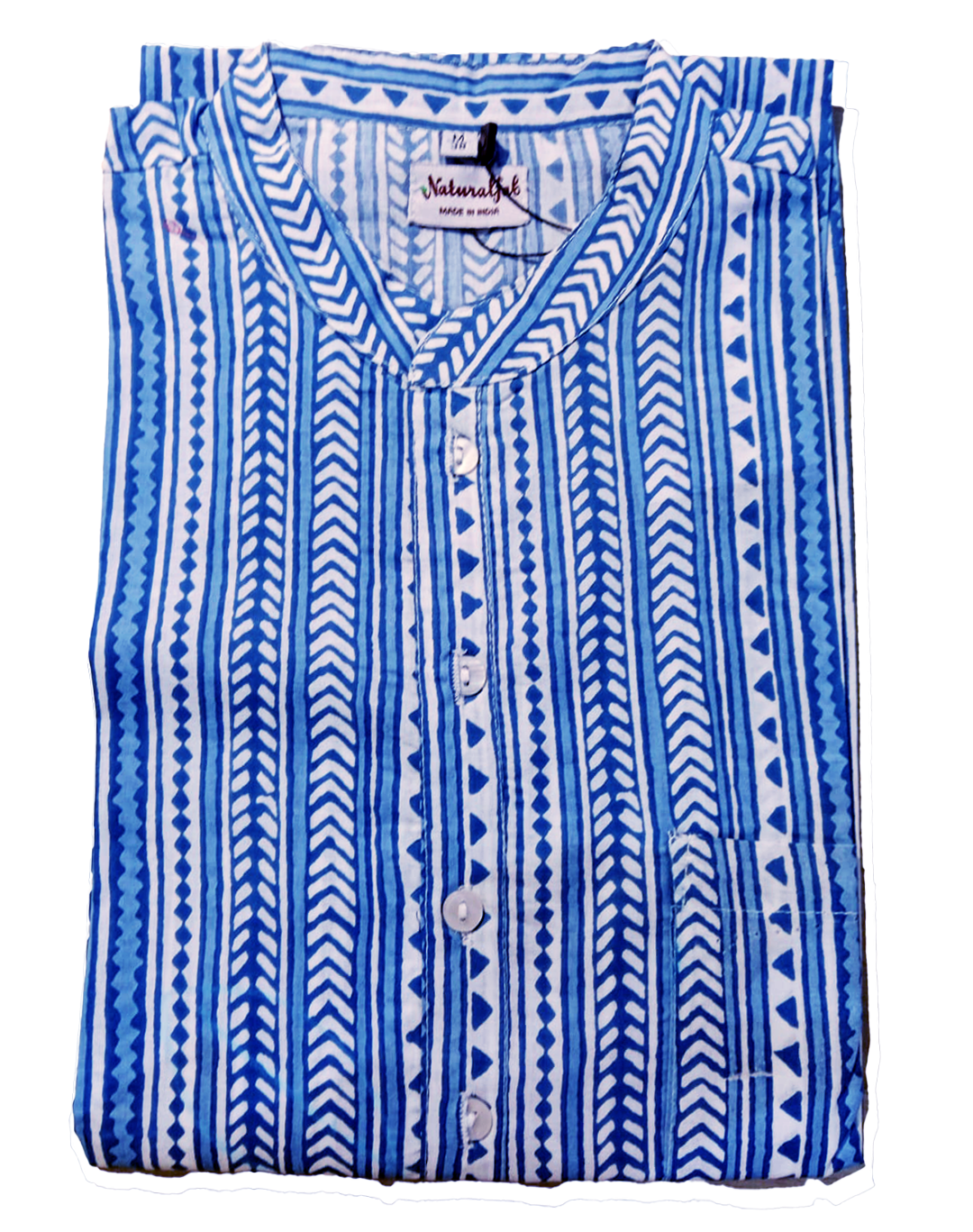 This men’s long kurta features a striking blue and white geometric striped design, perfect for adding a touch of elegance to any traditional or casual wardrobe. Made from soft, breathable fabric, this kurta is lightweight and comfortable for all-day wear. It has a simple yet stylish V-neckline with a button-down front, making it easy to wear. The kurta’s pattern reflects traditional craftsmanship, ideal for festive occasions or casual outings. Proudly made in India, it combines both cultural heritage and contemporary style.