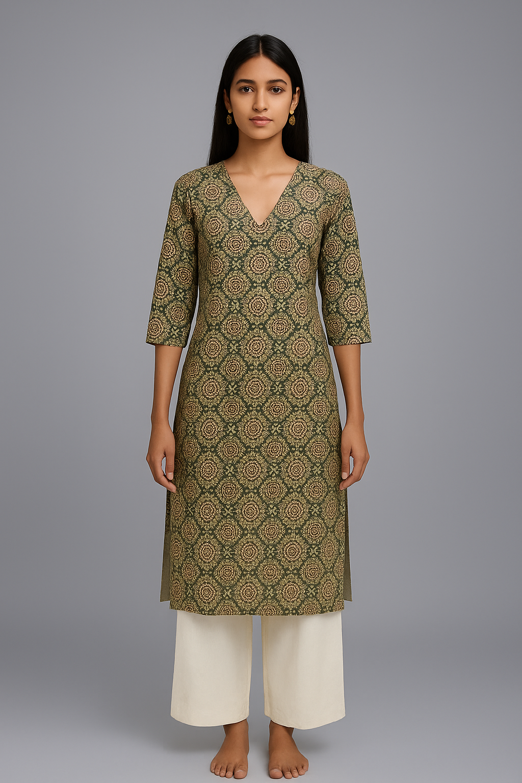 For women who appreciate heritage fashion, this yellow handblock kurti made with organic khadi cotton is a delightful choice. Its soft weave and vibrant print make it perfect for work or casual outings. The traditional block patterns reflect skilled Indian artisanship while the straight silhouette ensures comfort and grace. Lightweight and easy to maintain, this kurti is a symbol of sustainable living. Add flats or kolhapuri sandals to finish the look. Ideal for all skin tones and body types, it's a wardrobe essential. Buy from AdaviEmpire and embrace authentic Indian style with every thread.