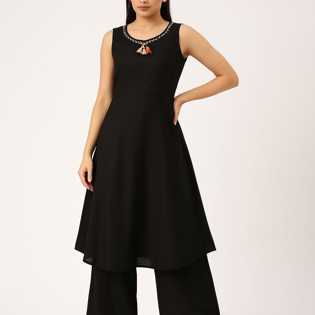 Trendy 3-Piece Palazzo Set for Women – Sleeveless Black Kurta, Wide-Leg Pant & Beige Long Printed Jacket