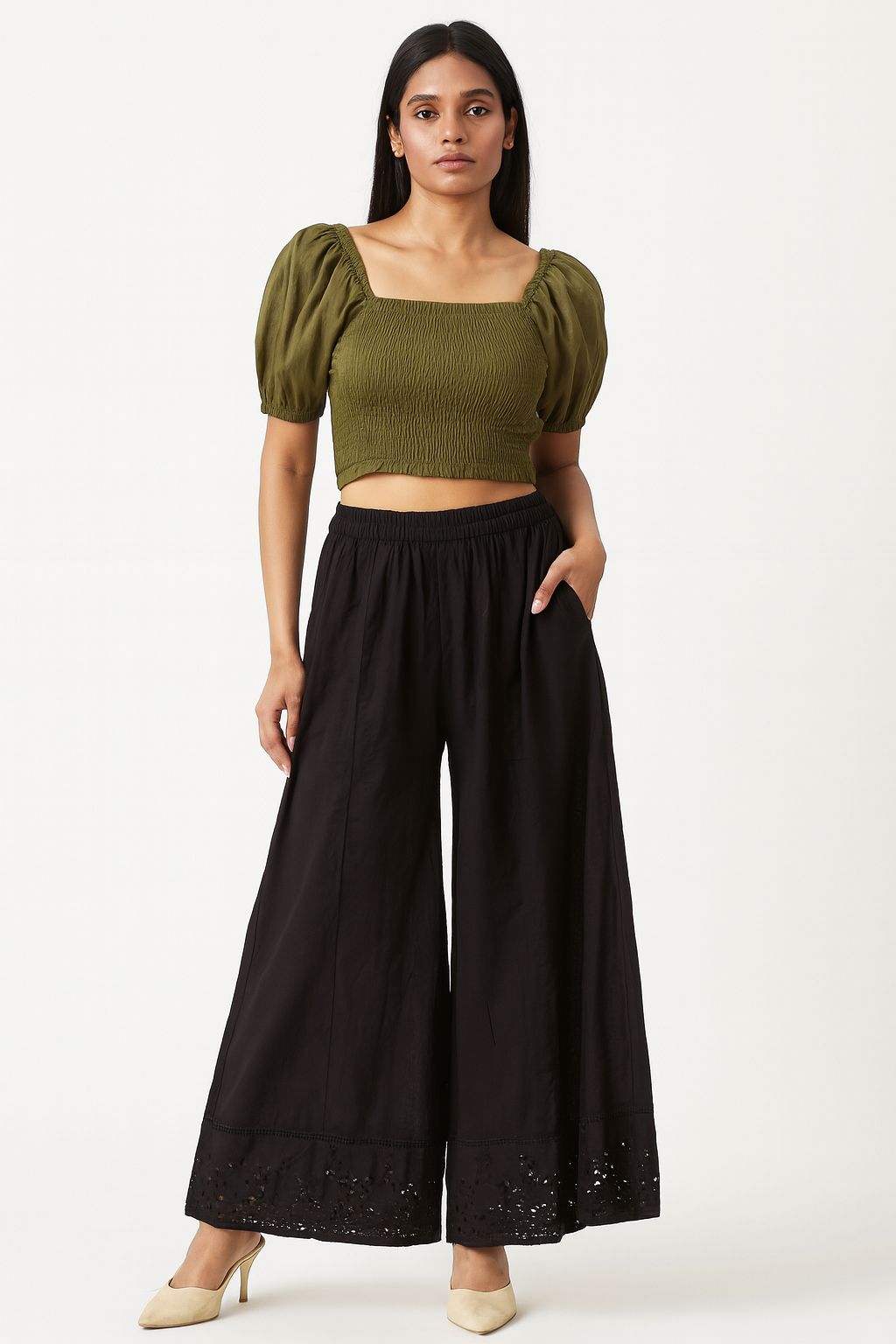 Women’s Black Cotton Palazzo Pants with Pocket & Embroidered Hem – Stylish Wide Leg Bottoms