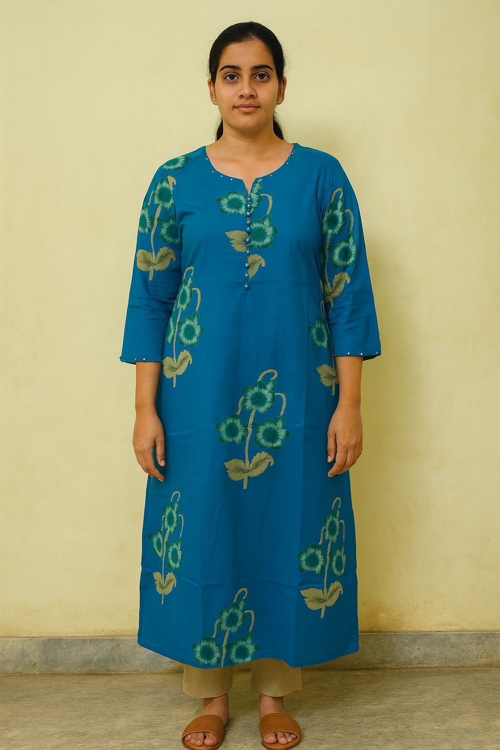 Add charm to your ethnic collection with this blue cotton kurti for women, designed with elegant floral prints for a refreshing look. Crafted from breathable cotton fabric, it features a round neckline with button detailing, 3/4th sleeves, and a straight-fit silhouette, ensuring comfort with style. Perfect for office wear, festive gatherings, daily wear, and casual outings, this versatile kurti pairs beautifully with palazzos, leggings, or straight pants. A timeless piece that blends traditional elegance with modern simplicity.