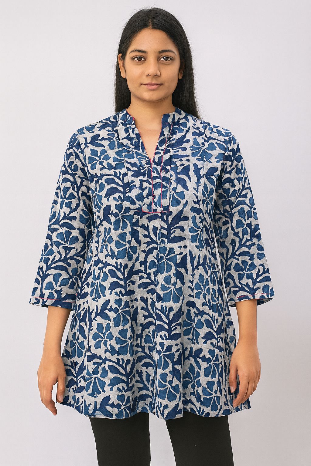 Women’s Blue Rayon Short Kurti – Block Printed A-Line Tunic for Casual & Office Wear