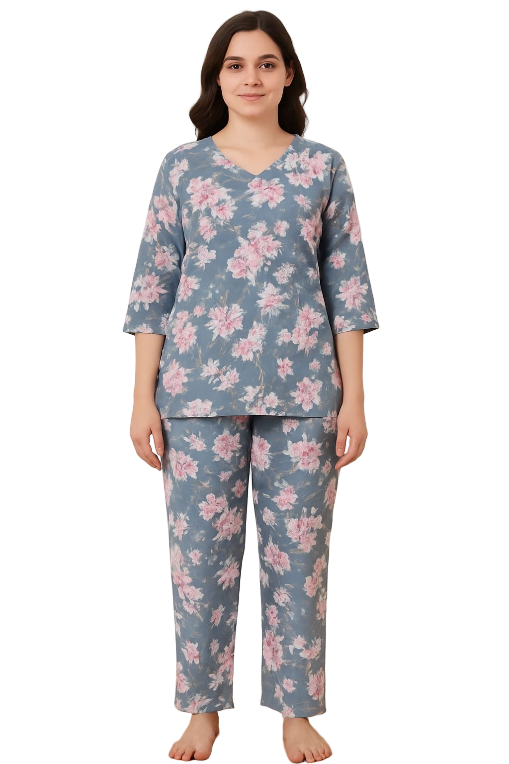Step into comfort and style with this blue cotton floral night suit set designed for modern women. Featuring a V-neck kurta with 3/4th sleeves and matching straight-fit pants, this set combines elegance with ease. The soft cotton fabric keeps you light, breathable, and cozy, making it perfect for a restful sleep or relaxed home lounging. The all-over pink floral print on a serene blue base adds a refreshing, feminine charm.