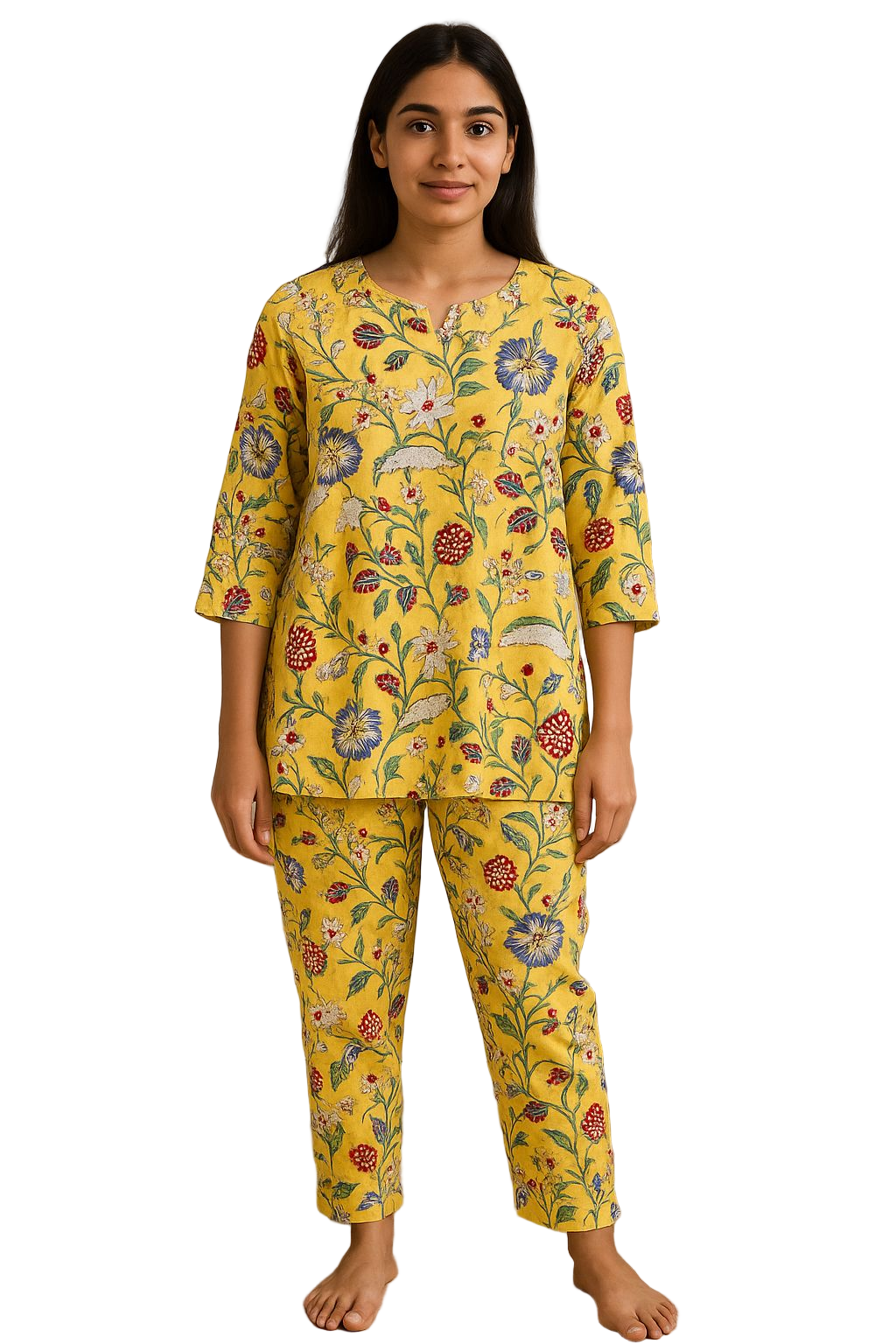 Bring home effortless comfort with this yellow cotton night suit set featuring a vibrant all-over floral print. Designed with a relaxed straight kurta and matching pants, this set is perfect for cozy nights and laid-back mornings. Crafted from breathable 100% cotton fabric, it keeps you cool, comfortable, and stylish all day long. The bright floral design adds a cheerful vibe, making it ideal not just for bedtime, but also for casual home wear or lounging.