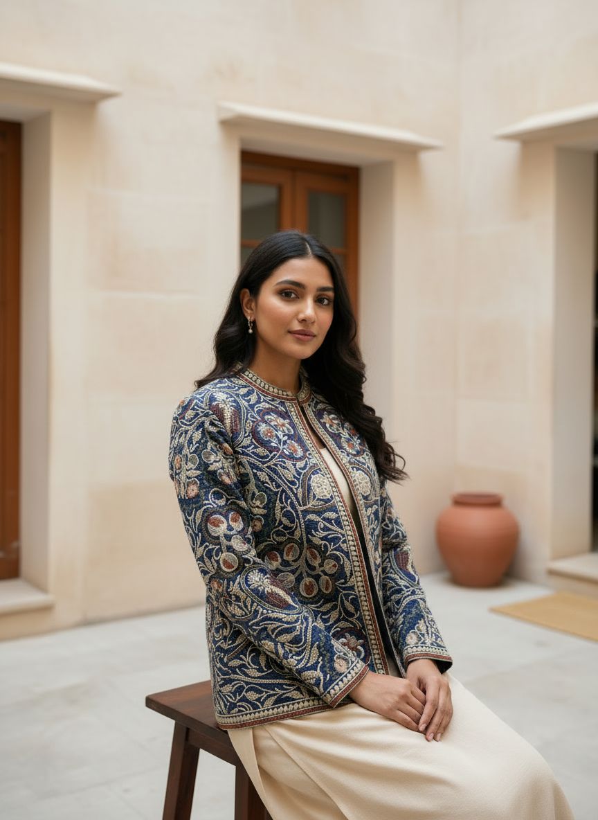 Elevate your winter wardrobe with this premium Premium embroidered jacket for women, beautifully crafted with intricate floral threadwork on a rich navy base. Designed to add elegance and warmth, this statement jacket blends traditional artistry with modern styling.