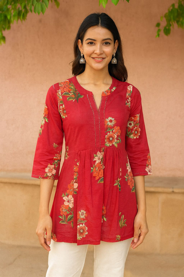 Women’s Red Cotton Short Kurti with Floral Print | Casual Ethnic Top for Daily Wear