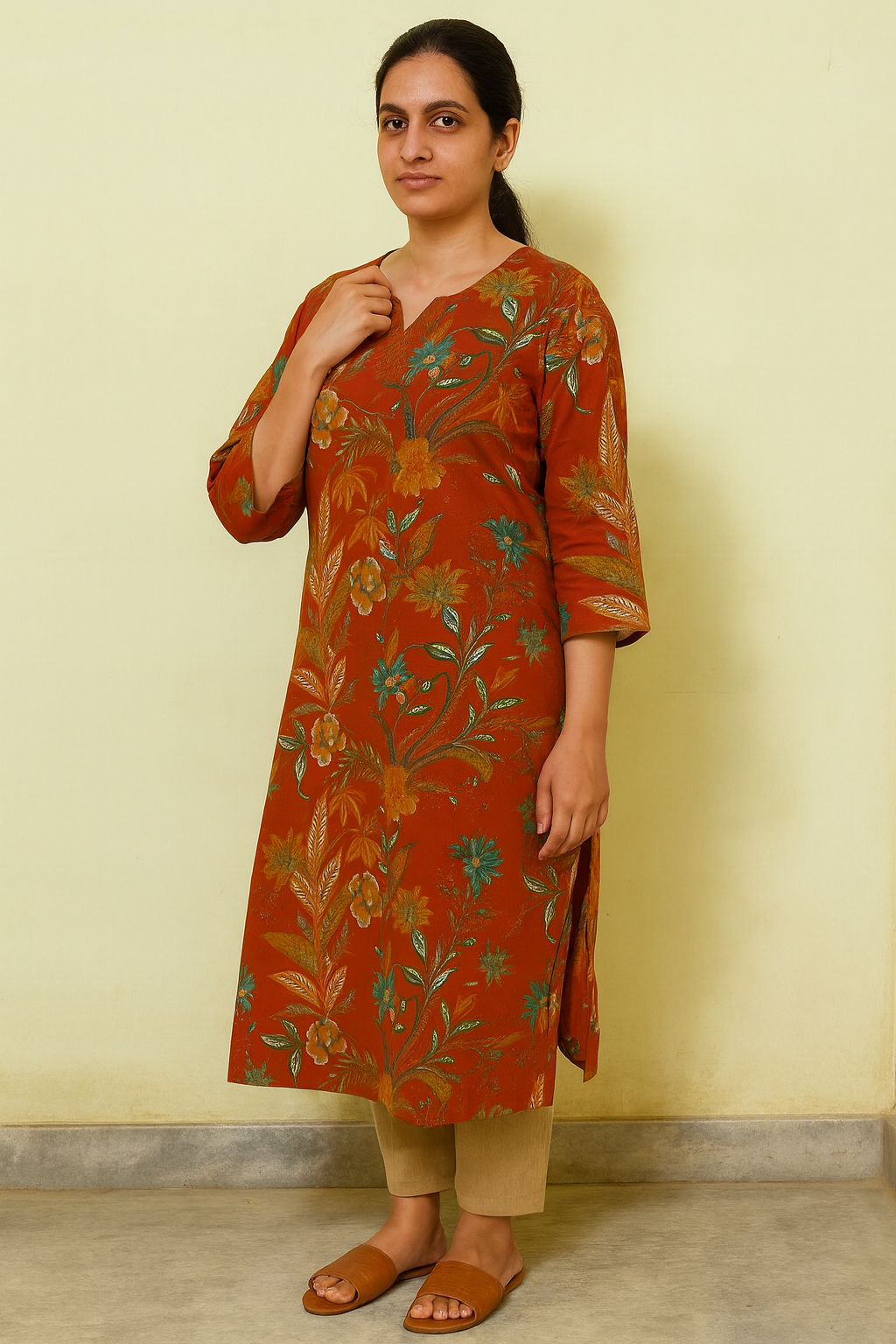 Women’s Rust Orange Cotton Kurti – Floral Printed Straight Fit with Notch Neck and 3/4th Sleeves