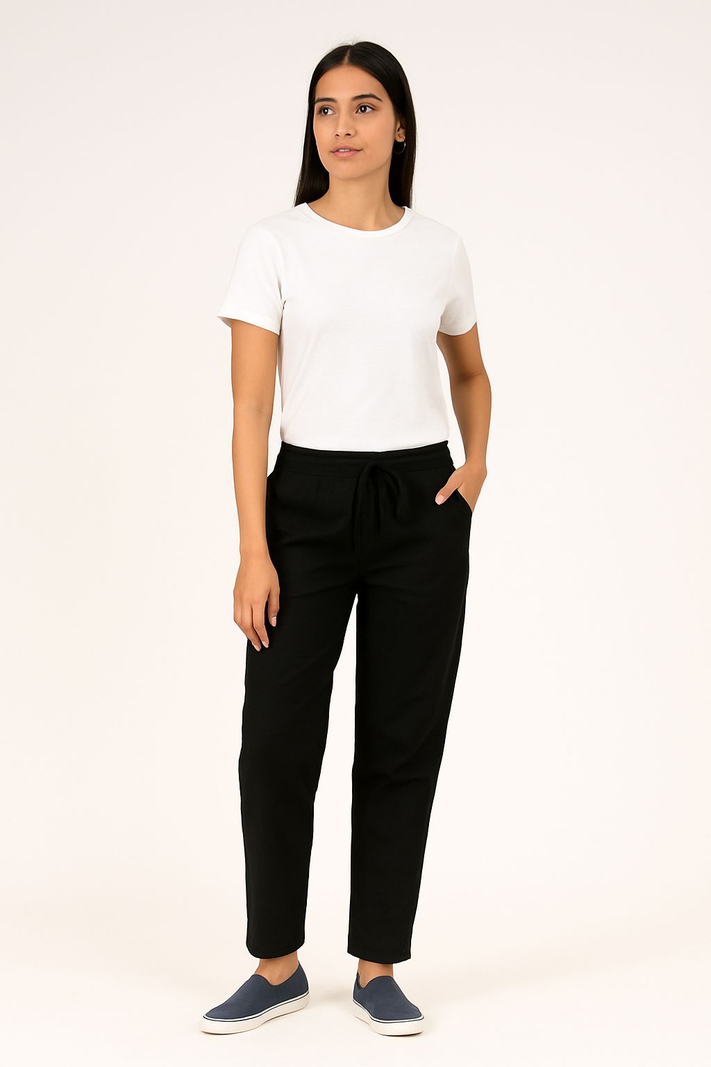 Women's Black Cotton Straight Pants with Pockets | Casual Drawstring Trousers | Natural Fab