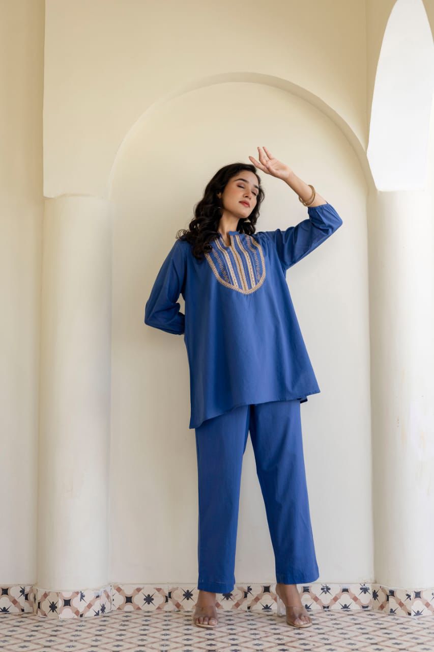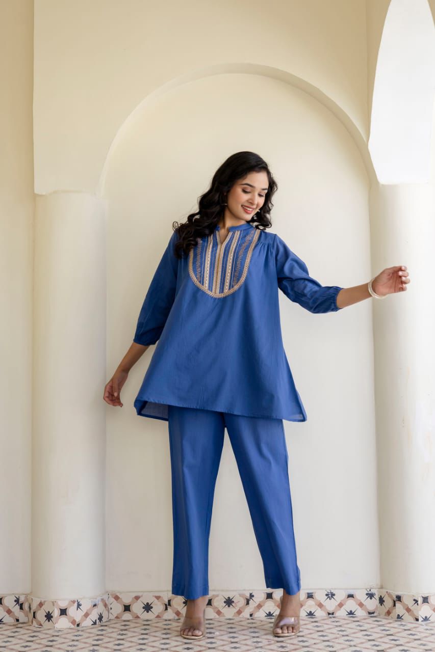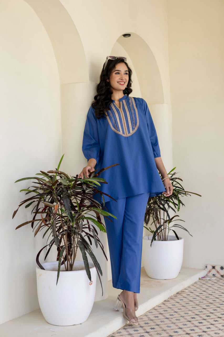 Women's Blue Cotton Co-Ord Set | Embroidered Kurta & Pants | Festive/Casual Wear | Relaxed Fit Ethnic Ensemble