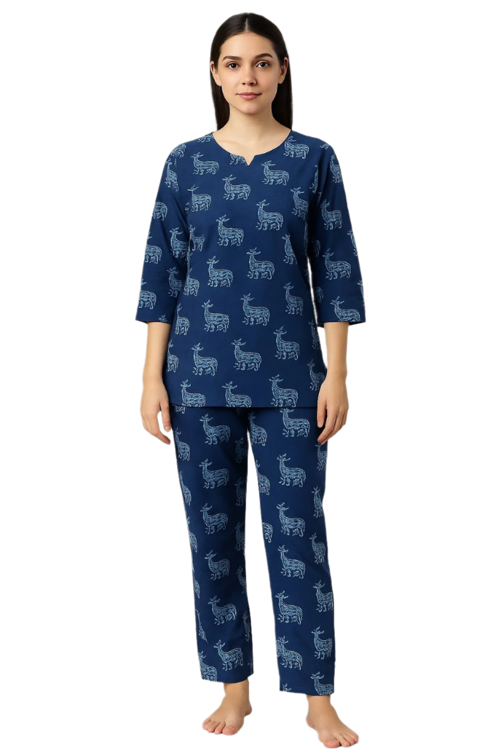 Women's Cotton Night Suit Set – Navy Blue with Handblock Deer Print