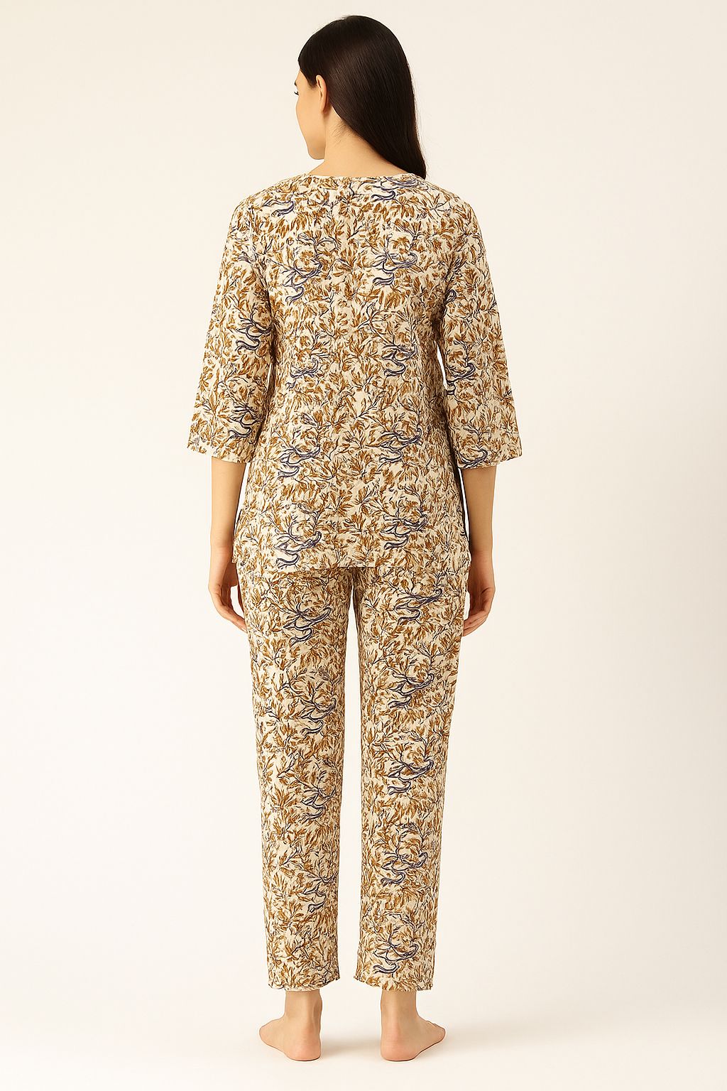 Women's Handblock Printed Cotton Night Suit Set – Mustard & Blue Floral Vines